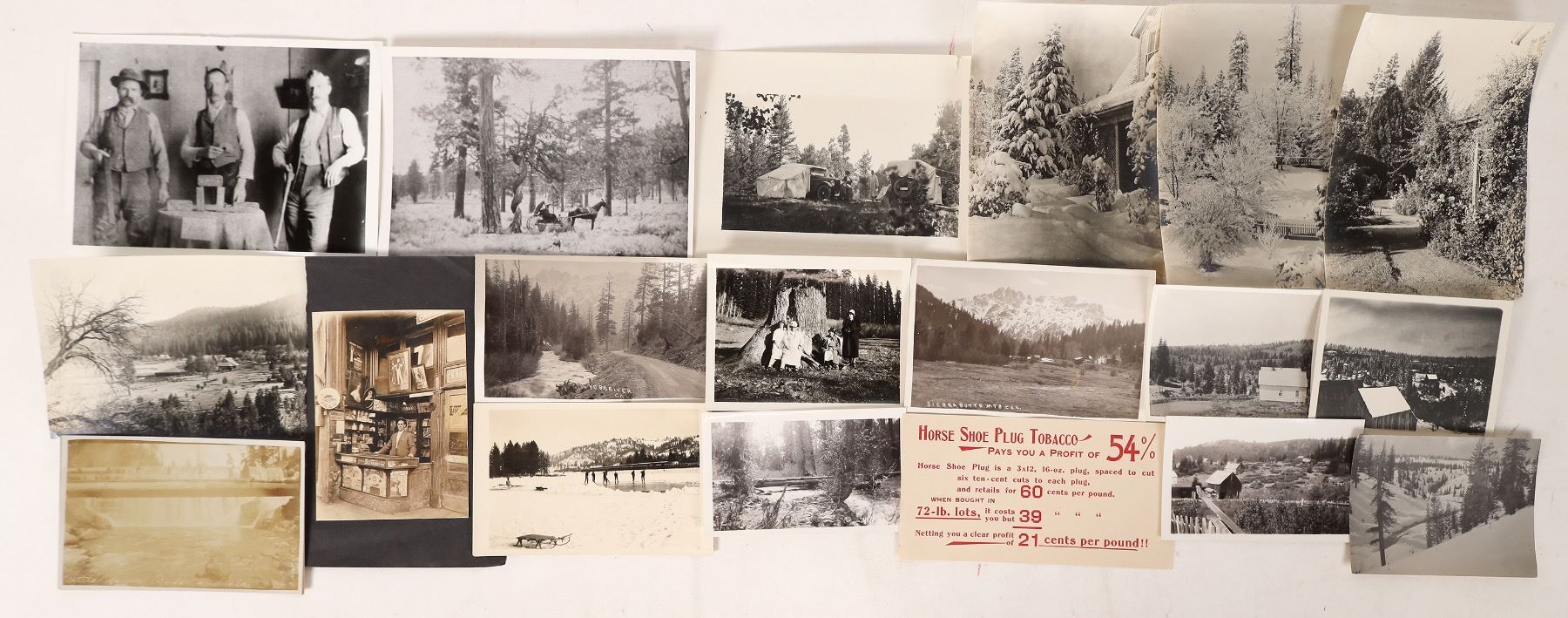 A collection of 5"x 7" and 4"x 5" photos showing various shots of Sierra County. There's also a posed photo of mine operators with five gold bars mined from the area. Also family camping trips. Please see photos for more details. California Sierra County 1900s