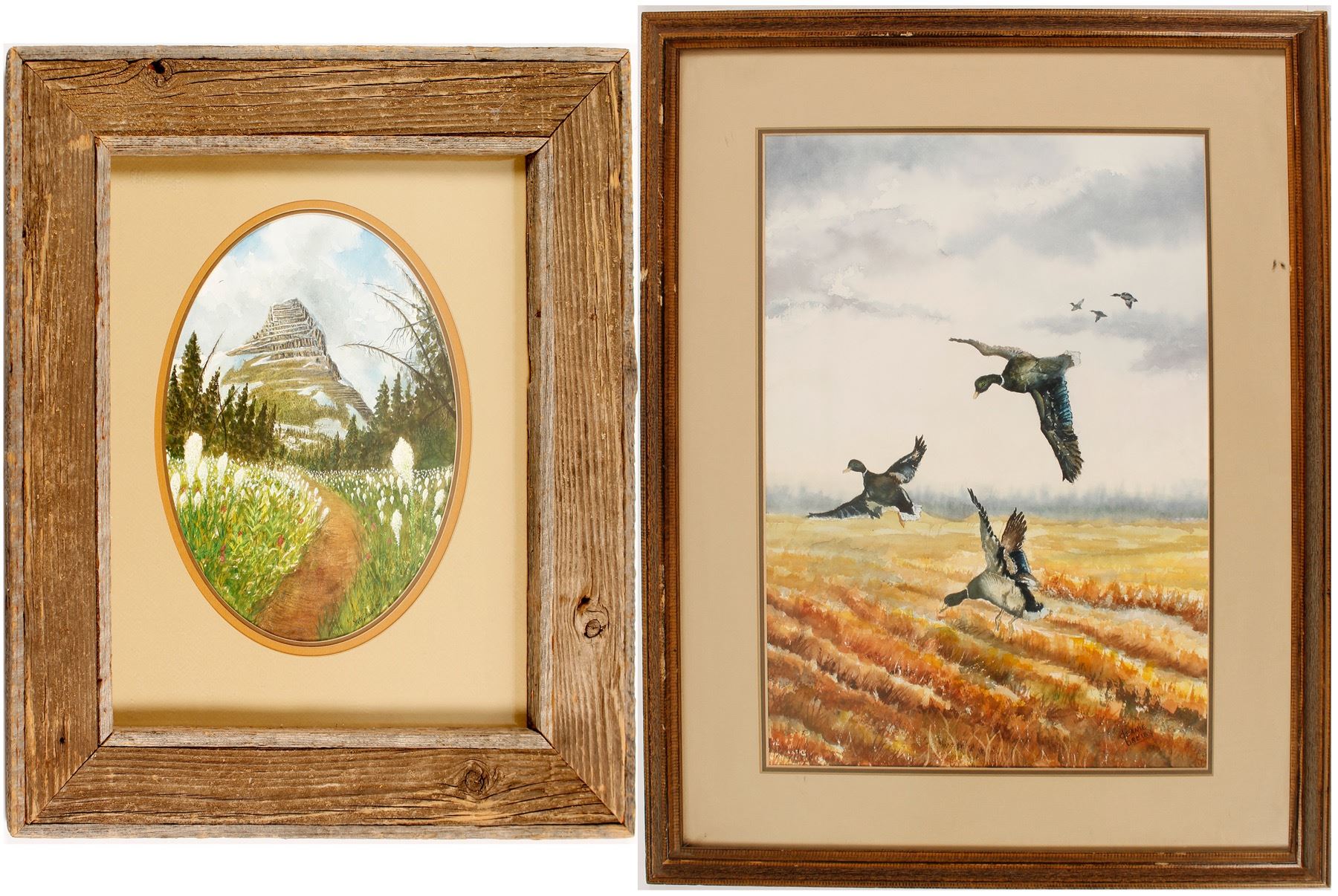 1) Scene of a meadow in the foreground and a mountain in the background. Signed Heffelfinger, 1980. 12" x 8.5", oval. Framed and matted 21.5 x 18.75". 2) Watercolor painting of Mallard ducks flying over a field by Deanie Breiby (from Montana). 20.5" x 14". Framed and matted 28.75" x 22.5".