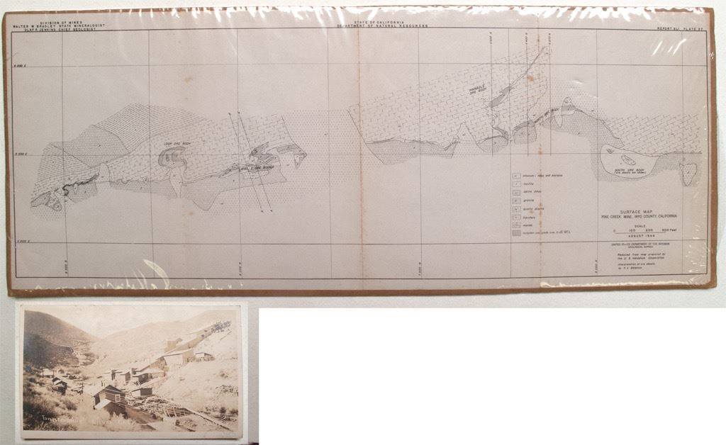 Very RARE view of the Scheelite Tungsten Mine in Pine Creek. Surface map of the Pine Creek Mine, 1944, United States Department of Interior, Geological Survey, P. C. Bateman. State of California, Department of Natural Resources, Report XLI, Plate 37. Very nice duo. (Ames Collection) City: Pine Creek State: California Date: hwac# 3825