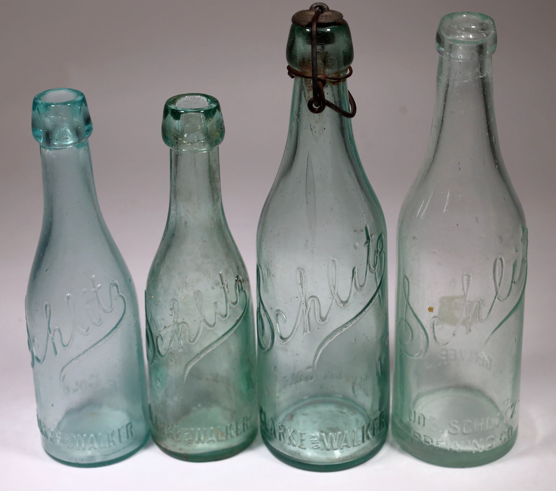 4 Schlitz beer bottles. Half pint aqua Schlitz/Clarke & Walker//Denver, Colo. Clear Schlitz/Jos. Schlitz/Brewing Co.//Denver, Colo. Light lime swingtop Schlitz/Clarke & Walker//Denver, Colo. Light lime half pint with great applied top Schlitz/Clarke & Walker//Denver, Colo. A few light dings.