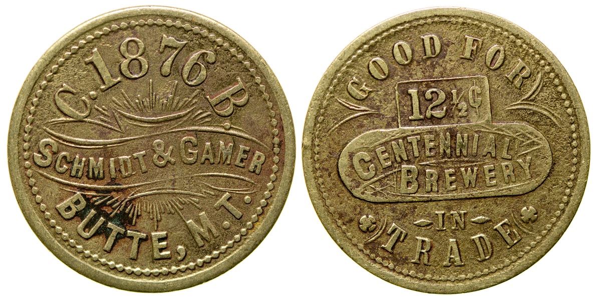 Territorial Montana. R-12. C.1876 B. / Schmidt & Gamer / Butte, MT. // GF / 12 1/2c / Centennial / Brewery / IT. Round, brass. (Svoboda Collection) City: Butte State: Montana Date: HWAC# 33870