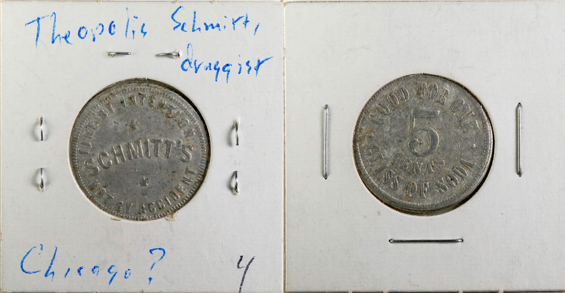 Obv.: Finest By Intention / Schmitt's / Not By Accident; Rev.: Good For One / 5 / Cents / Glass of Soda. Wm., rd., 24 mm. Possibly Theopolis Schmitt, Druggist, 111th & Michigan, Chicago, IL. N.A.R.D. Notes - Volume 10, Issue 26 - Page 1686; 1910. & Schmitt's Reliable Drug Store, Rochester, has moved from 316 North street, a location occupied by that business for fifty years to 211 Noth Street, corner Cumberland. National Association of Retail Druggists, Volume 29 - Page 470 1919. (tokencatalog.com)..