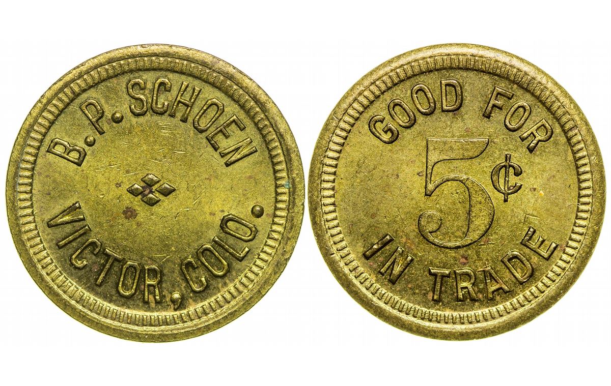 B. P. Schoen / Victor, Colo. // GF / 5c / IT. Finest known, uncirculated condition