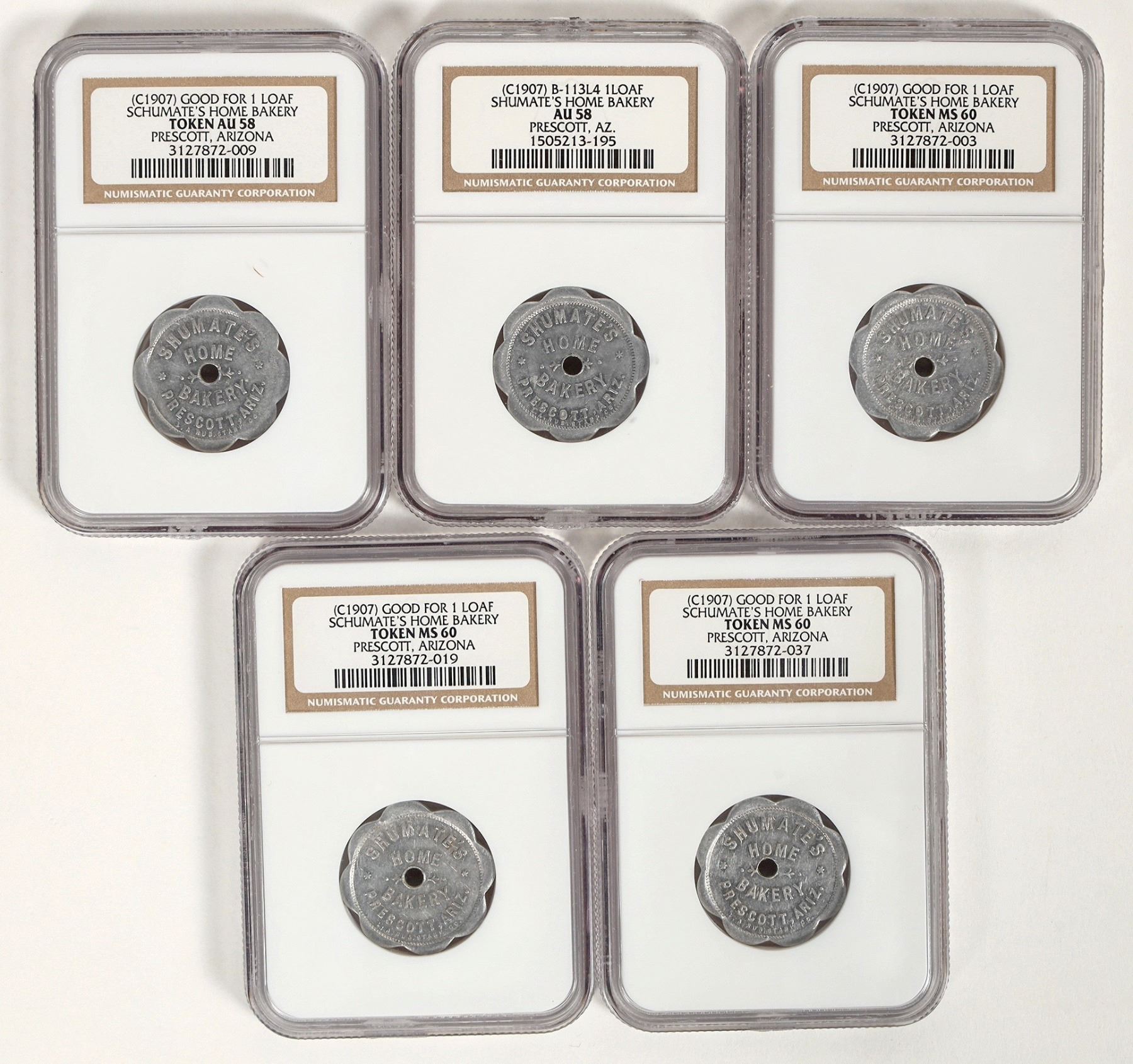Five NGC graded tokens: two AU 58, three MS 60. SHUMATE'S / HOME / BAKERY / PRESCOTT, ARIZ. / L.A. RUB. STAMP CO. // GOOD FOR / 1 / LOAF OF BREAD; center hole, Al., Sc 8, 27 mm. Spooner lists as R-3. According to tokencatalog.com: Ed Shumate issued 6 different Prescott tokens for his different businesses. He had a Saloon, this Bakery and a Resort called "Granite Dells".
