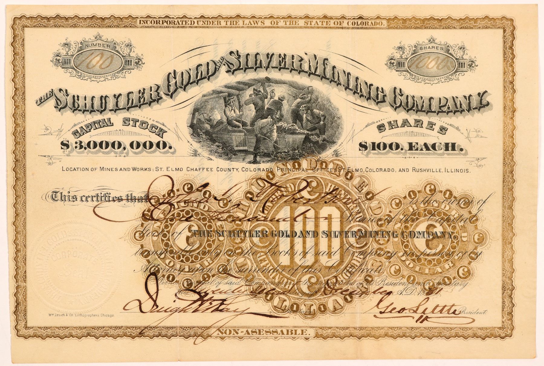 "Location of Mines and Works: St. Elmo, Chaffee County, Colorado" (printed under vignette). Inc. in Colorado. No. 100, issued for 1,000 shares to John Robertson on Dec. 22nd, 1881. Signed by president George Little and secretary Dwight Ray. Not cancelled. Gold border, black print, underground mining vignette, and RN facsimile underprint. Printed by Zeuch & Co., Chicago. Pinholes, folds, some toning. 6.75 x 9.75" They owned the Silver King and nine other lode claims on the west slope of Mammae Mountain, Chalk Creek Mining District. One of their claims contains thirty veins in granite rock, 30-50 ounces silver per ton. Developed by a 225 foot long cross-cut and a drift on the Silver King. [Corregan & Lingane, 1883, pgs. 108-109] Ken Prag Collection