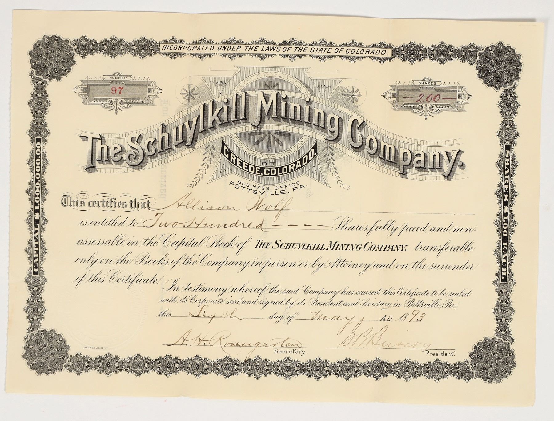 "of Creede, Colorado." Office in Pottsville, PA. Inc. in Colorado. No. 97, issued for 200 shares to Allison Wolff in 1893 in Pottsville. Signed by the president (illegible) and secretary Rosengarten. Not cancelled. Black border and print, ornate company logo. No vignette. Printed by Gies & Co, Buffalo. Heavy folds, toning. 7.75 x 10.5"According to Colorado Miner (Weekly), Volume III, Number 38, July 1, 1893, manager FP Rosengarten has returned to camp and will begin working on the Red Jacket group of claims on Campbell Mountain.