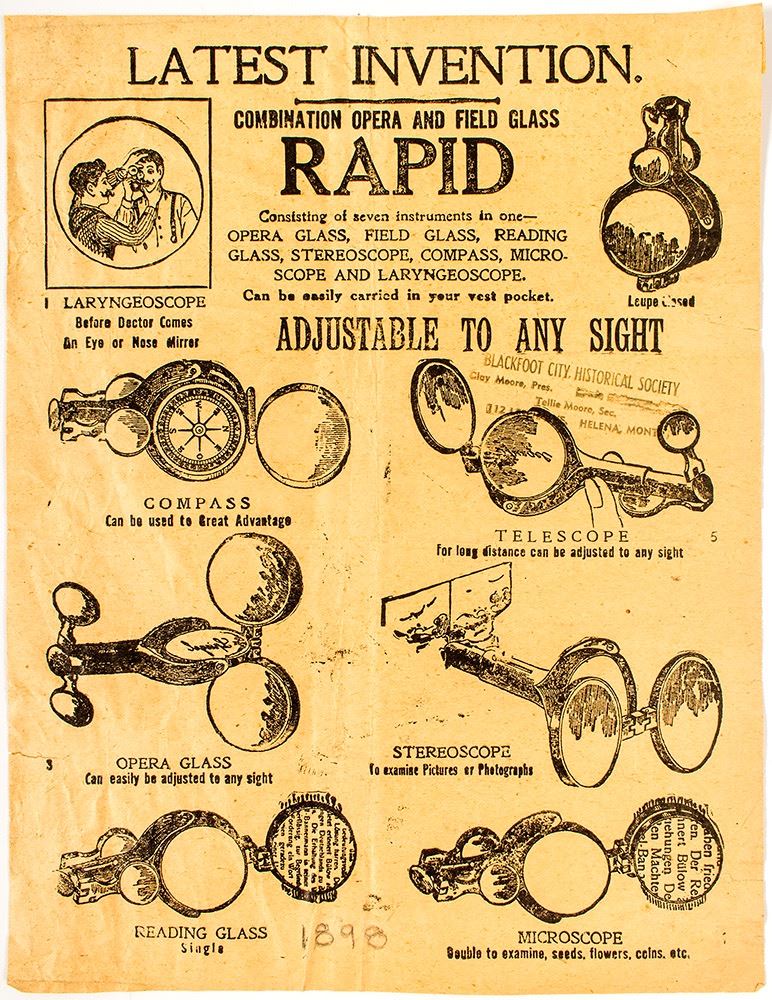 Rare advertising paper for a new invention comprising a compass, telescope, opera glass, stereoscope, reading glass and microscope. City: State: Date: HWAC# 50276