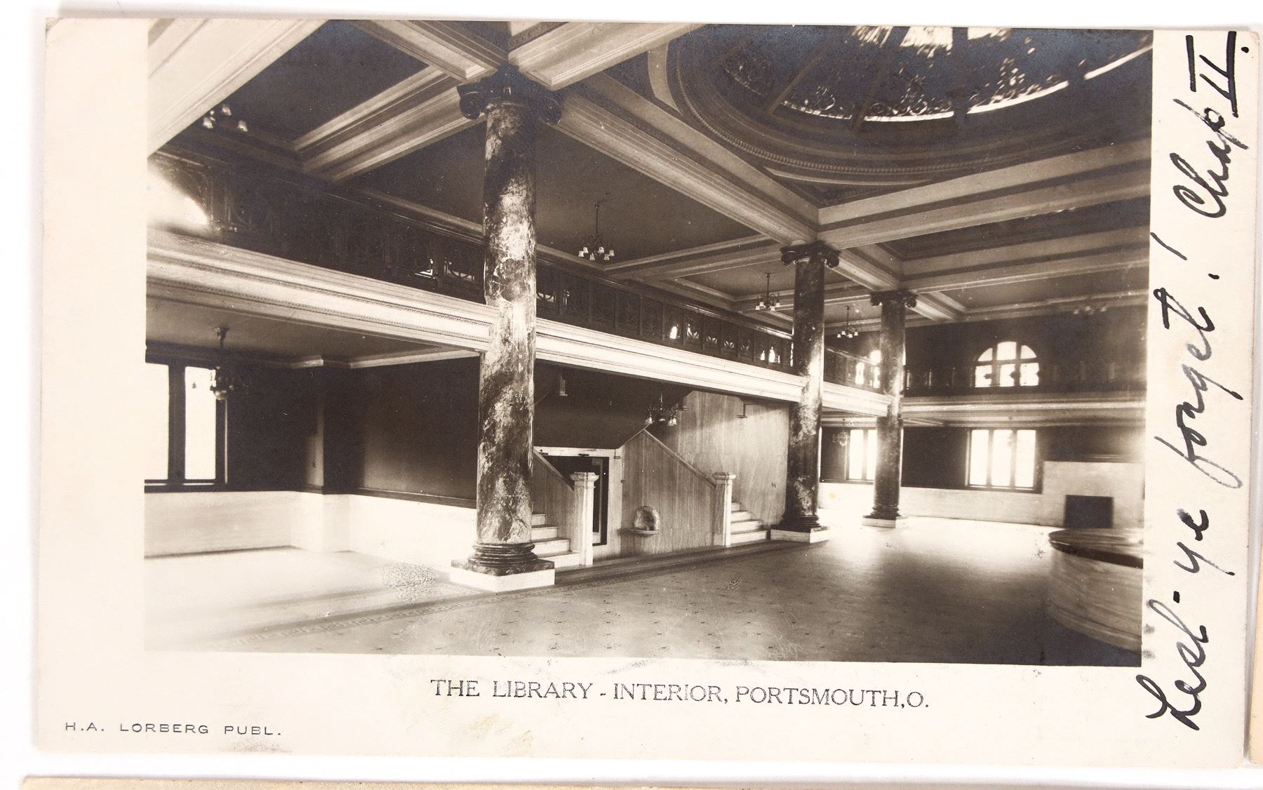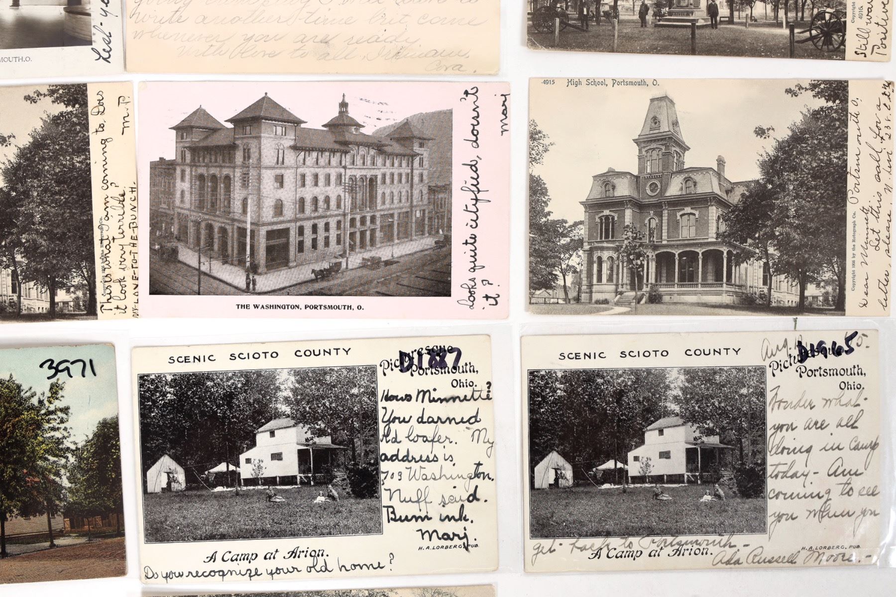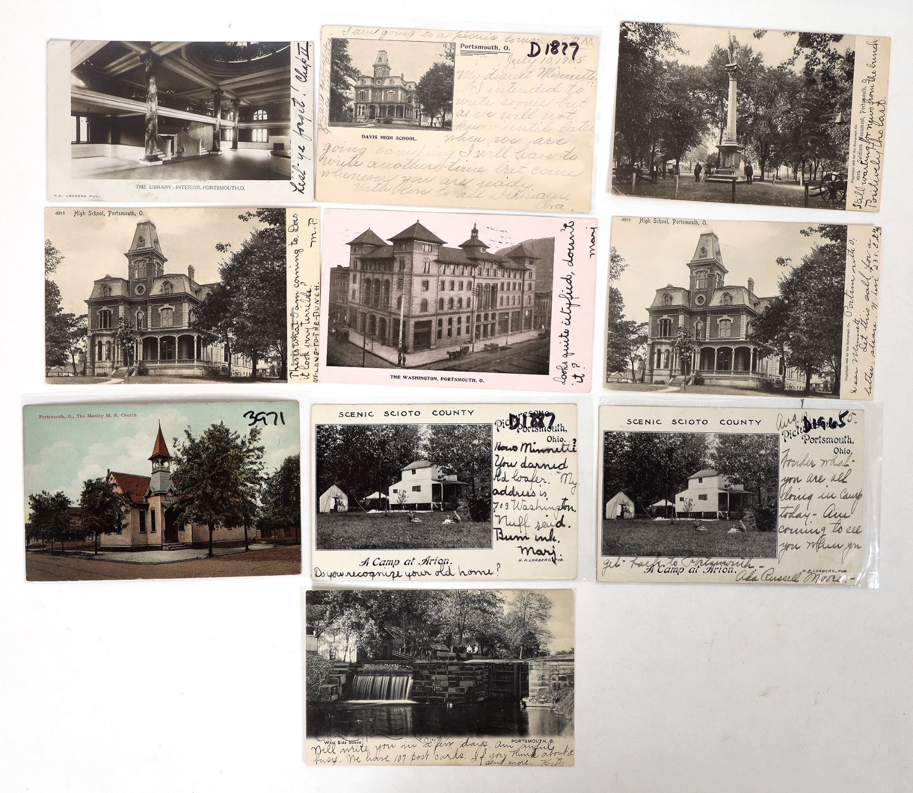 Collection of 10 postcards from Scioto County, town of Portsmouth, Ohio, c1905-06. Includes 2 pioneer cards postmarked 1905, 6 others postmarked 1905, 1 from 1906. Library, high school, Soldier's Monument, Manley M.E. Church, etc.[ Portsmouth Ohio