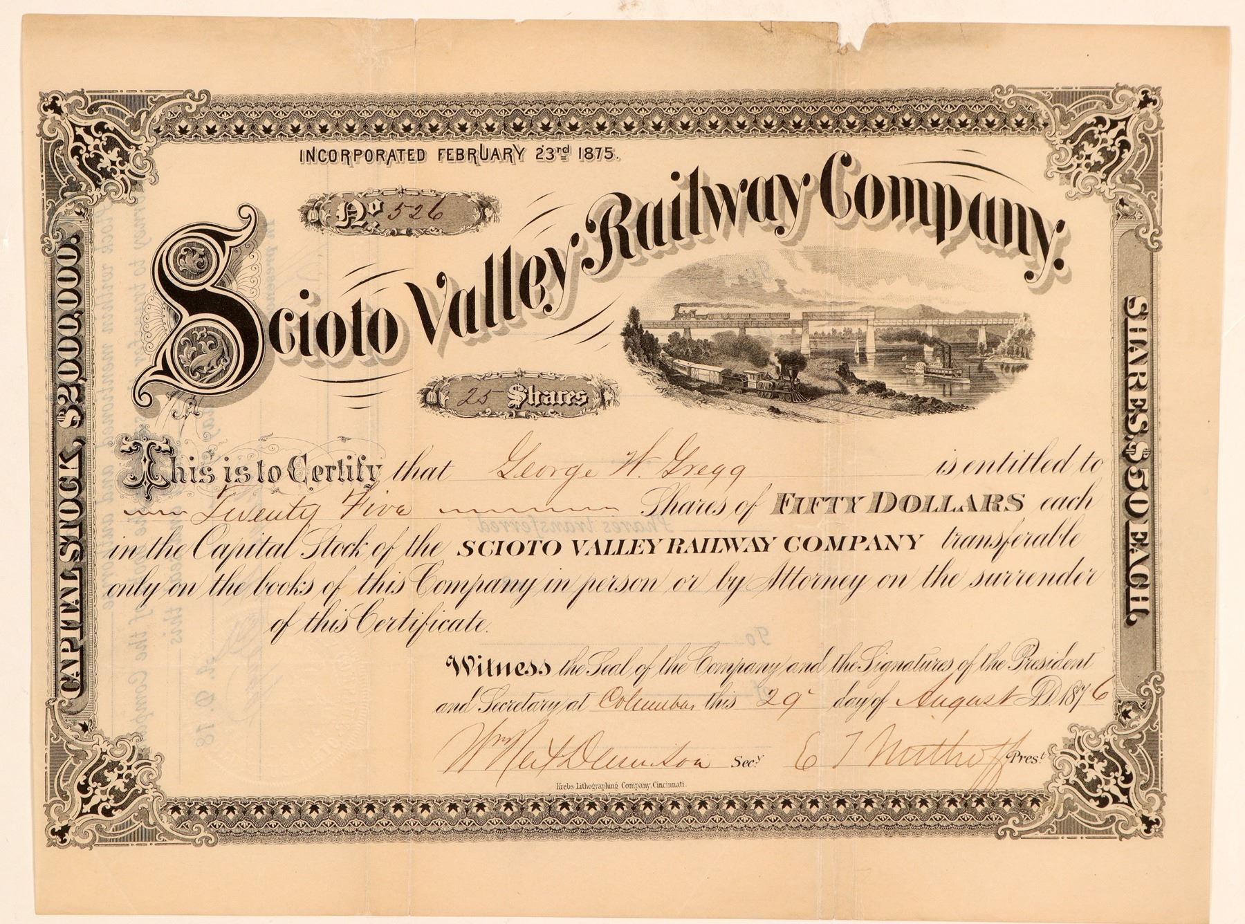 Incorp 1875 Ohio. #526, I/U, 25 shares @ $50 par. Issued to George W. Gregg Aug. 29, 1876. Signed G.T Mirthoff, President. BLACK, embossed seal w/4-4-0 loco center. Vignette 4-4-0 round curve w/second train on bridge. Krebs Lithographing Co. printer. VF Ken Prag Collection