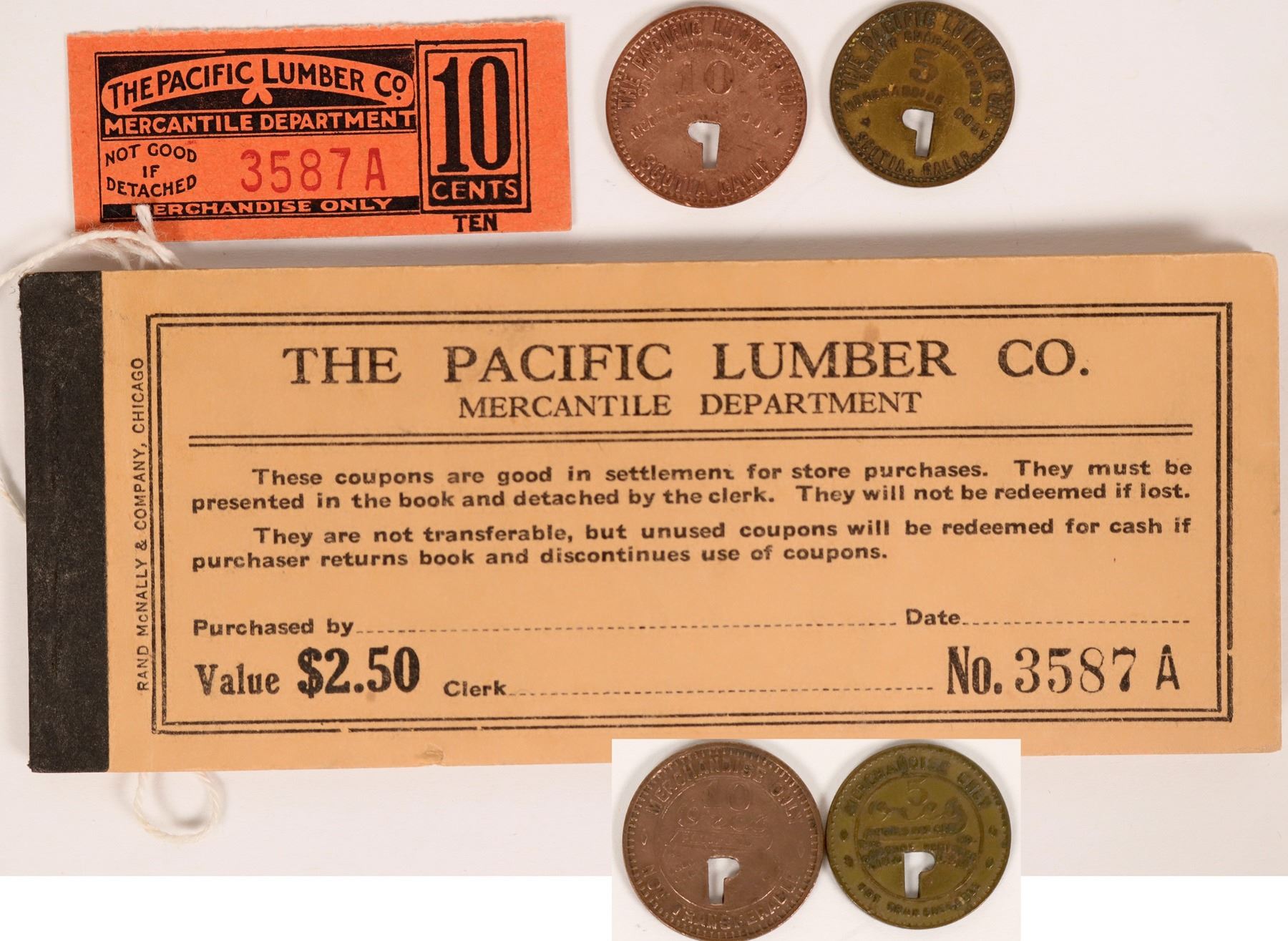 Two metal tokens GF 5 and 10 cents; Coupon book good in settlements for store purchases at The Pacific Lumber Co. Mercantile Department. Ex: Ron Lerch Collection.