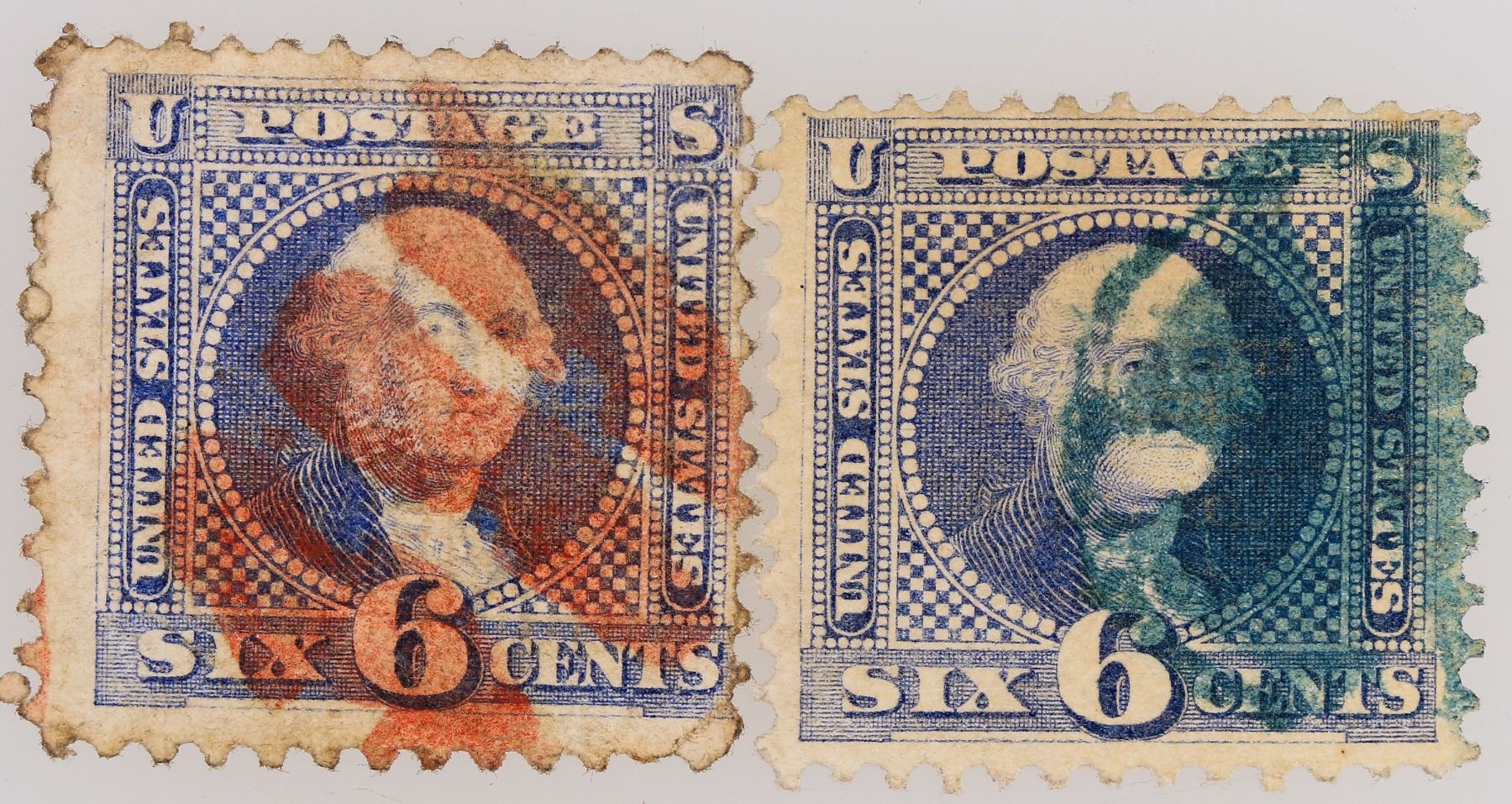 Scott #115, blue Washington 6c stamps, pair. Red and blue cancelation marks. Red mark stamp is dirty with a right corner fold. Blue mark stamp, perforation missing on the upper right. See photo.