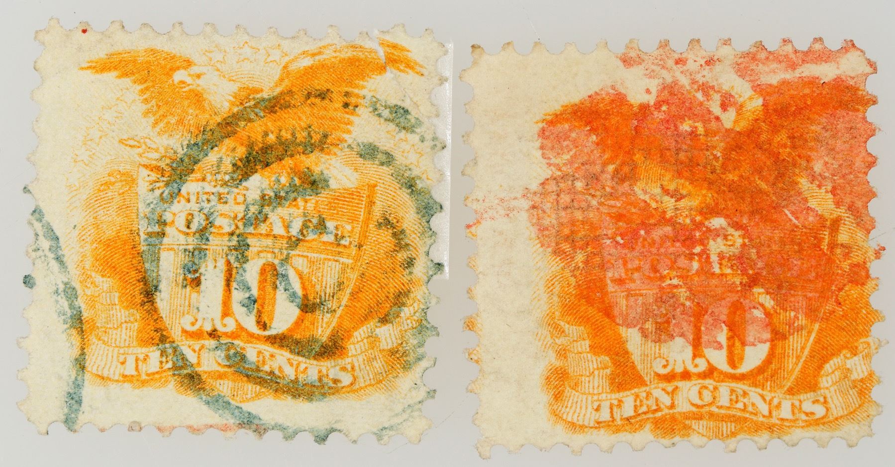Scott #116, orange 10c stamps, pair. Red cancelation mark and blue bullseye. Poor centering on both stamps. See photo.