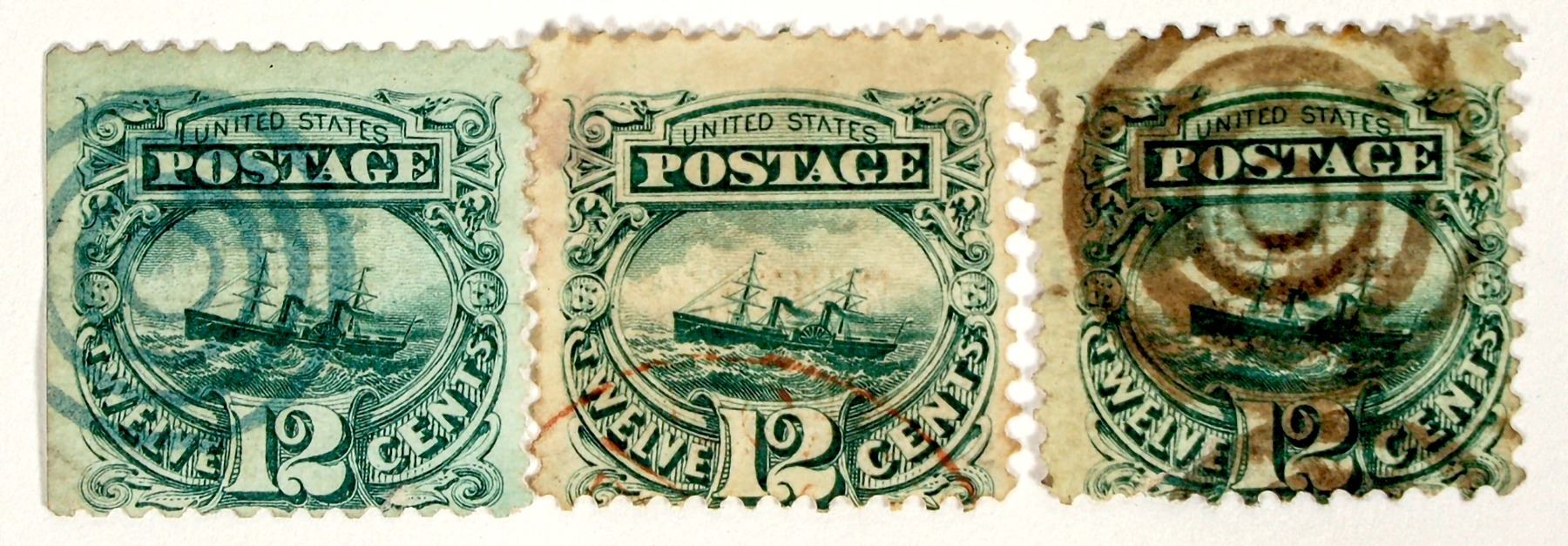 Scott #117, green 12c ship stamps, 3 different cancel mark colors. Green cancelation mark on the left edge page stamp, red cancelation mark, black cancelation mark. None are well centered. See photo.