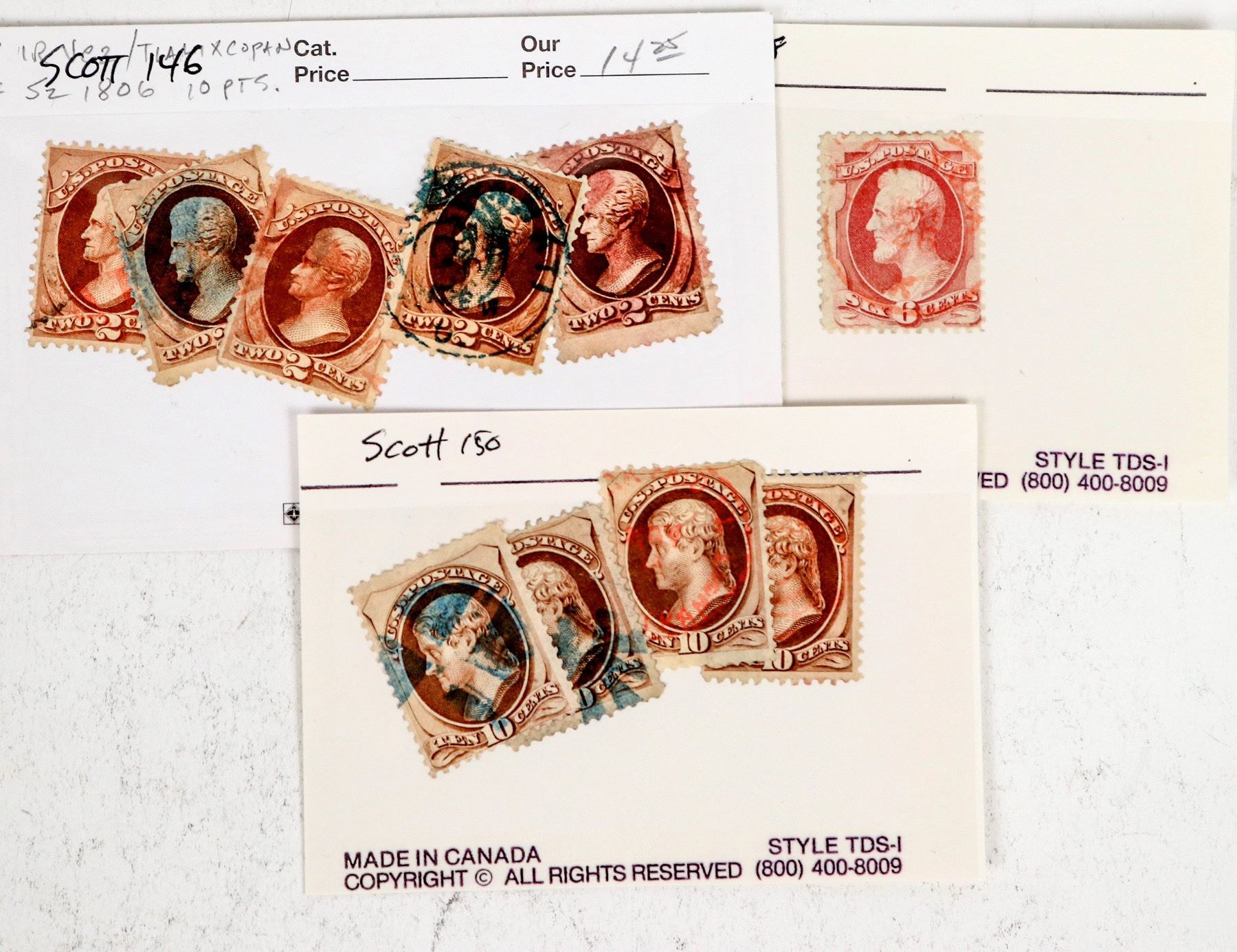 Scott #146 2c stamps (5), Scott #150 10c stamps (4), & Scott #148 6c stamp. None are perfect. Variety of cancelation colors/marks. See photo.