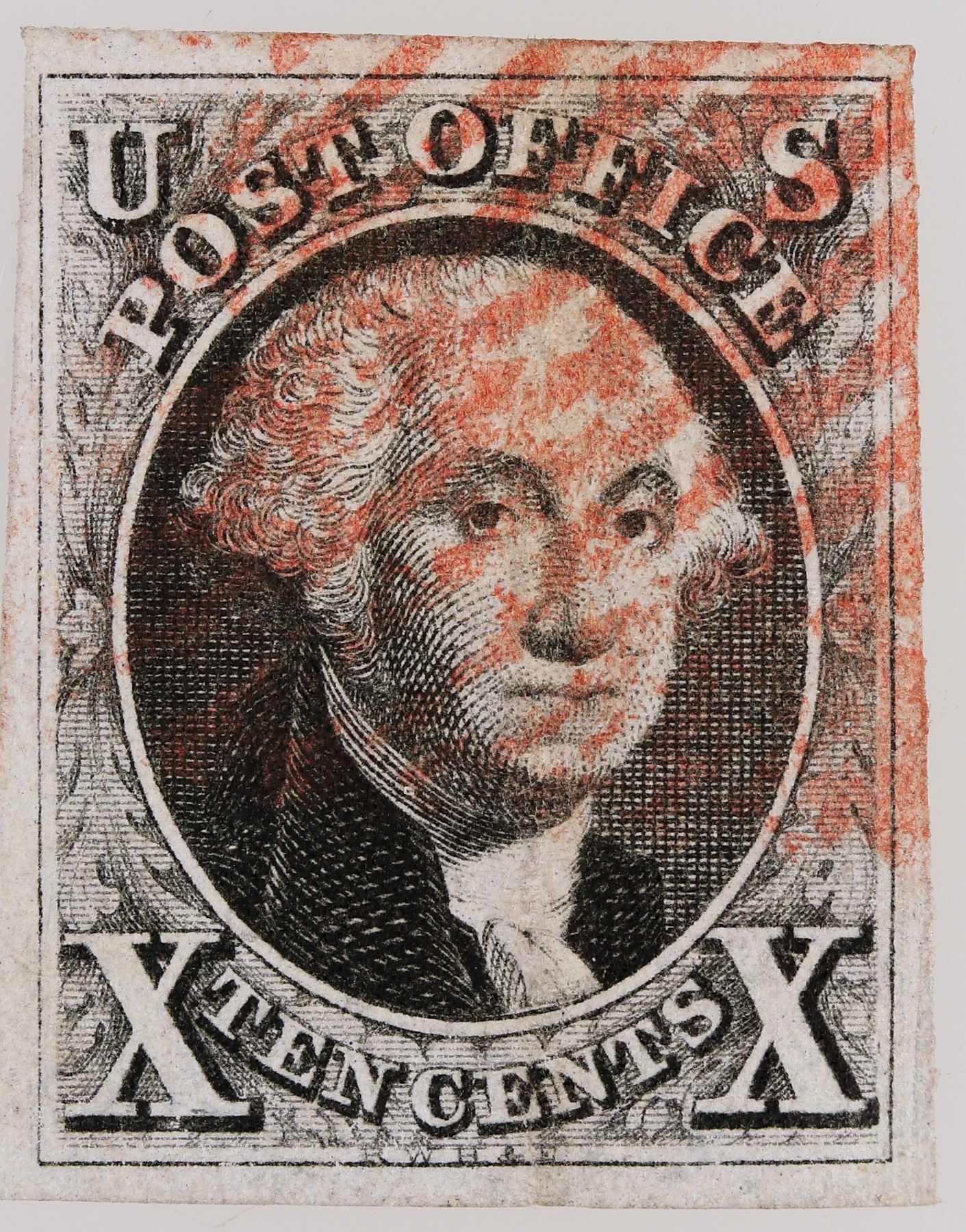 Scott #2, black Washington 10c stamp. Red cancelation mark. Uneven cut: wide bottom, tight cut on the upper left. The cuts do not penetrate the border line. Rare. See photo.
