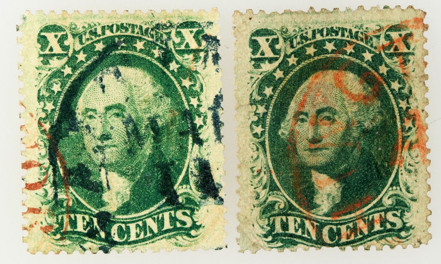 Scott #35, Washington 10c stamps in green and dark green color variants. Green stamp with red & blue cancelation marks. Dark green stamp with red cancelation mark. Perforations cut into the bottom edge of both designs. See photo.