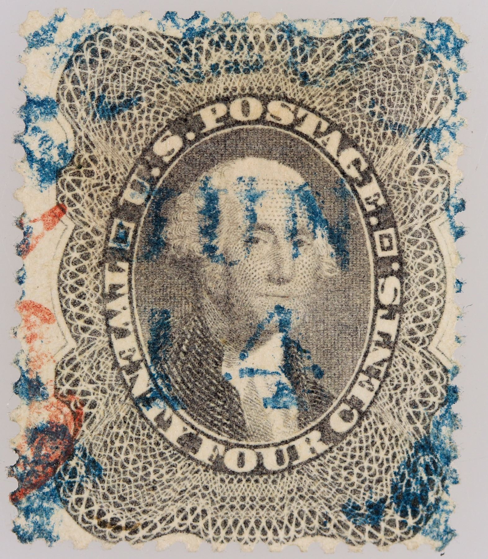 Scott #37, Washington 24c stamp. Red and blue cancelation marks. Designs sits to the right on the perforation square. Some minor soiling on the perforations. See photo.