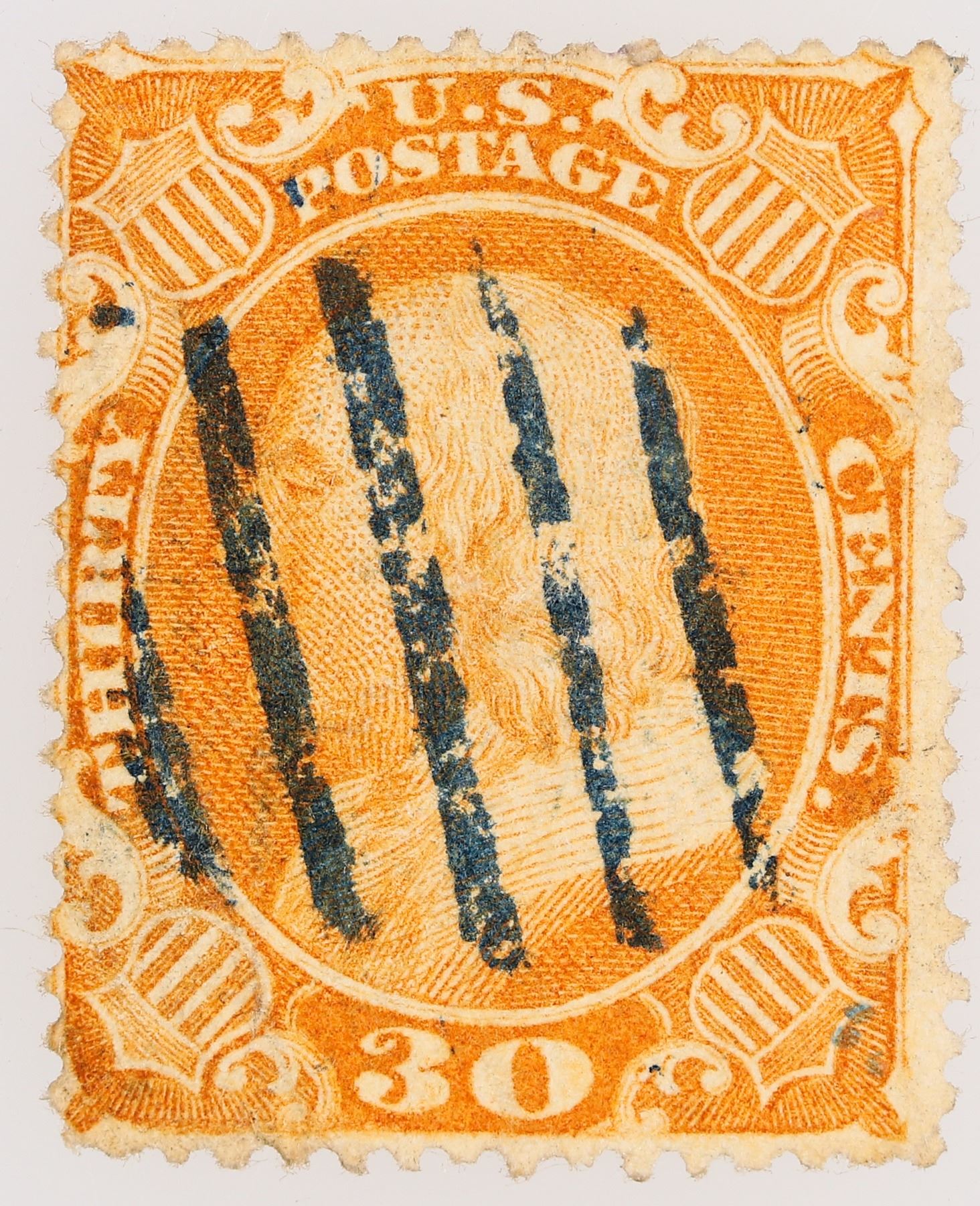 Scott #38, orange Franklin 30c stamp. Soiling on perforations. Perforations cut into the design on the left edge. See photo.