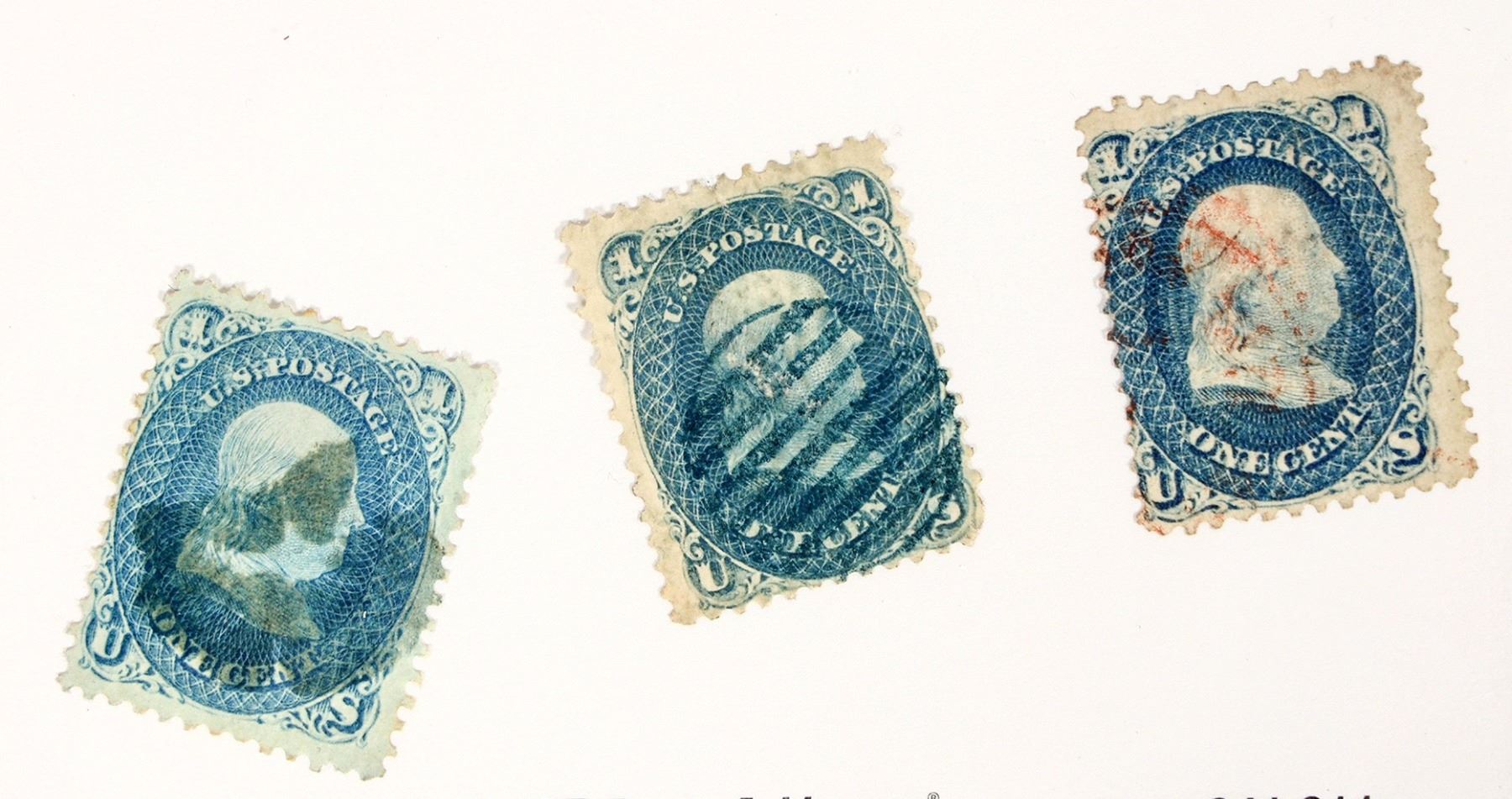 Scott #63, blue Franklin 1c, three subtle color varieties. Blue, black, red cancelation marks. None are well centered. See photo.