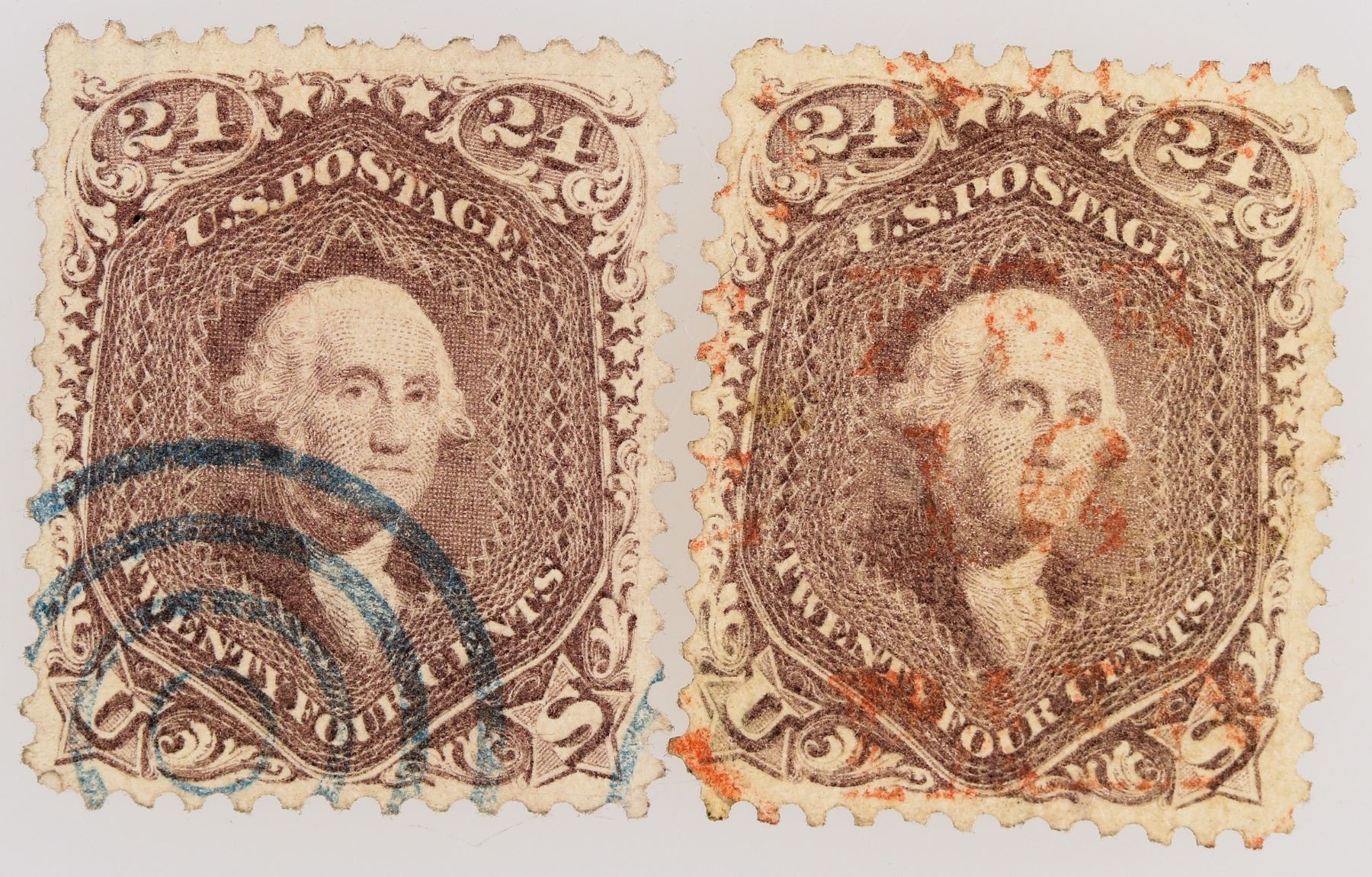 Scott #70A, possibly also #70. Washington 24c stamps. Red lilac and brown lilac stamps. Both are well centered. Red and blue cancelation marks. See photo.