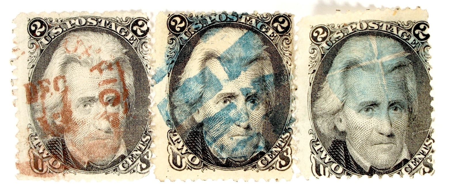 Scott #73, black Jackson 2c stamps, 3. Perforations cut into design on each. Red and blue cancelation marks. See photo.