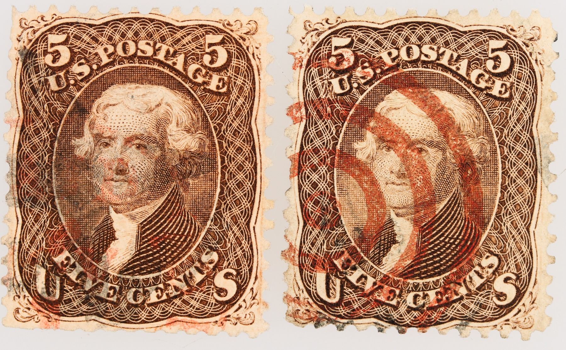 Scott #76, Jefferson 5c, red/brown stamp pair. Both stamps are well centered--only one top border is penetrated by perforations. Red bullseye mark stamp is folded on the upper right corner. See photo.
