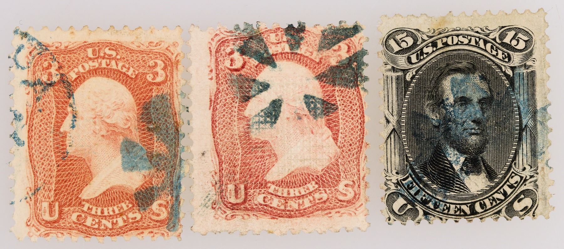 Scott #91 with E grill, black Lincoln 15c stamp, poorly centered. Includes Scott #88 with E grill and Scott #94 with F grill. See photo.