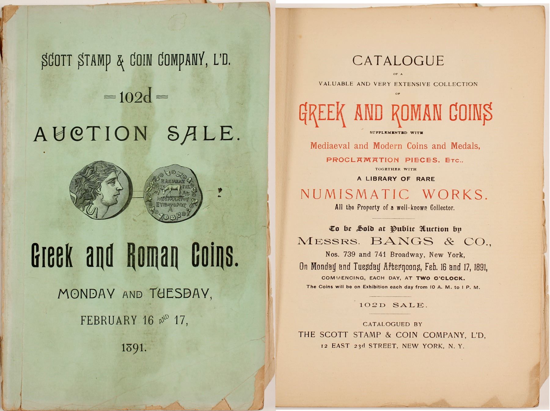 Scott Stamp & Coin Company, Ltd. 102nd auction sale was held February 16 & 17, 1891. Prices dutifully scribed next to the lot number in elegant penmanship. The green covered pamphlet is 5 3/4 x 9 inches, 95 pages.