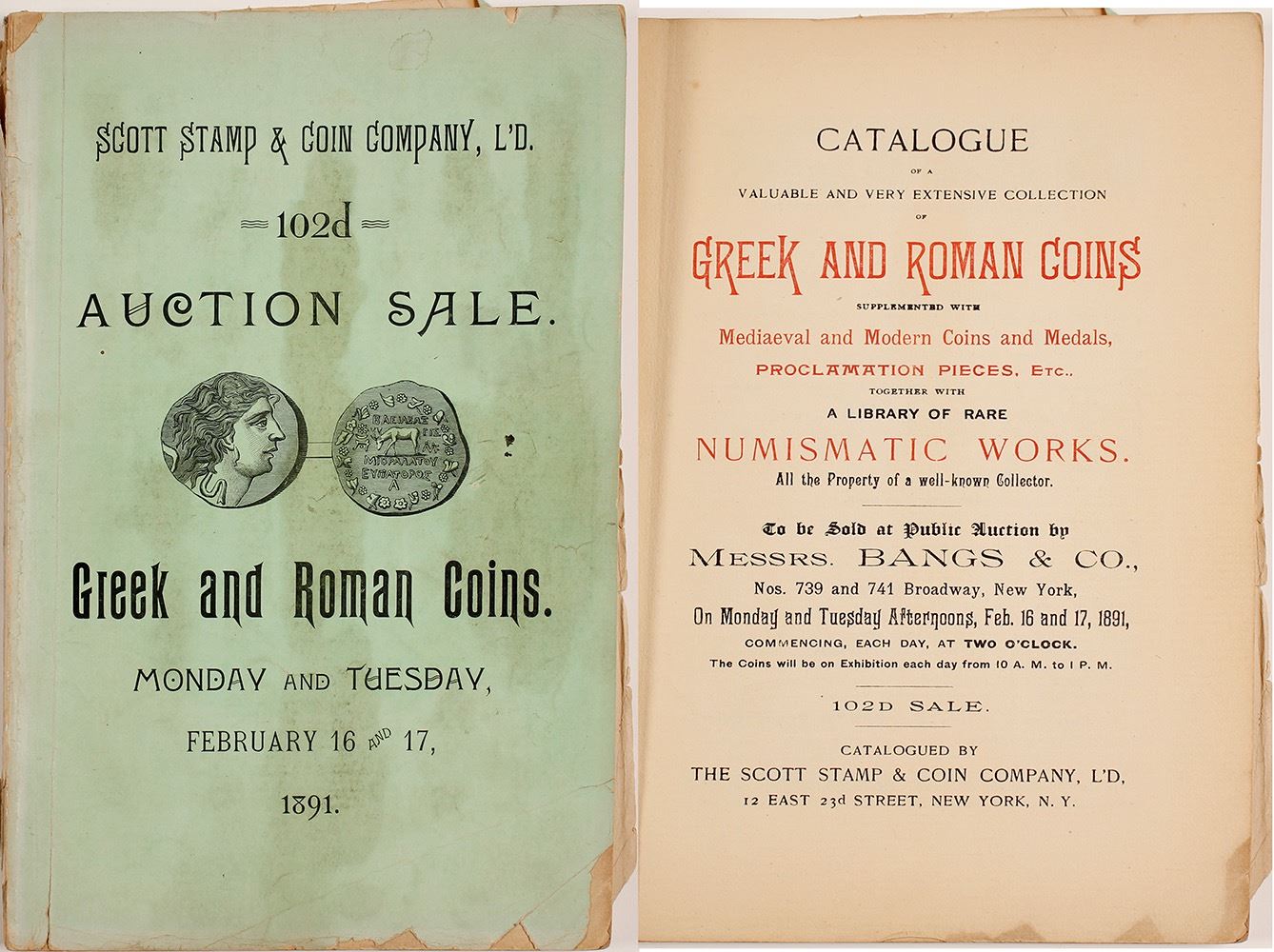 Scott Stamp & Coin Company, Ltd. 102nd auction sale was held February 16 & 17, 1891. Prices dutifully scribed next to the lot number in elegant penmanship. The green covered pamphlet is 5 3/4 x 9 inches, 95 pages. HWAC# 61948 Date: 1891 Location: