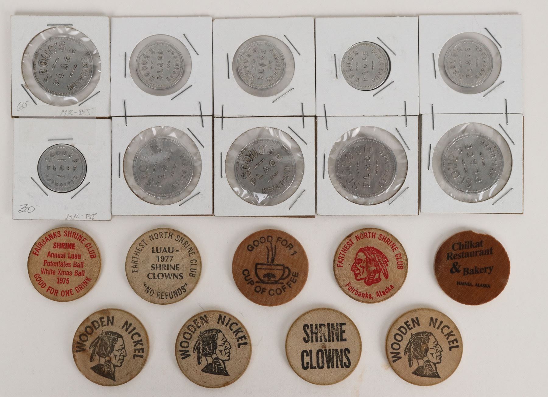 GOOD FOR / - / 50¢ / - / IN TRADE; Al., rd., 31 mm. Also nine wooden nickels: Fairbanks Shrine Club; Haines: Chilkat Restaurant & bakery. [ Ketchikan Alaska