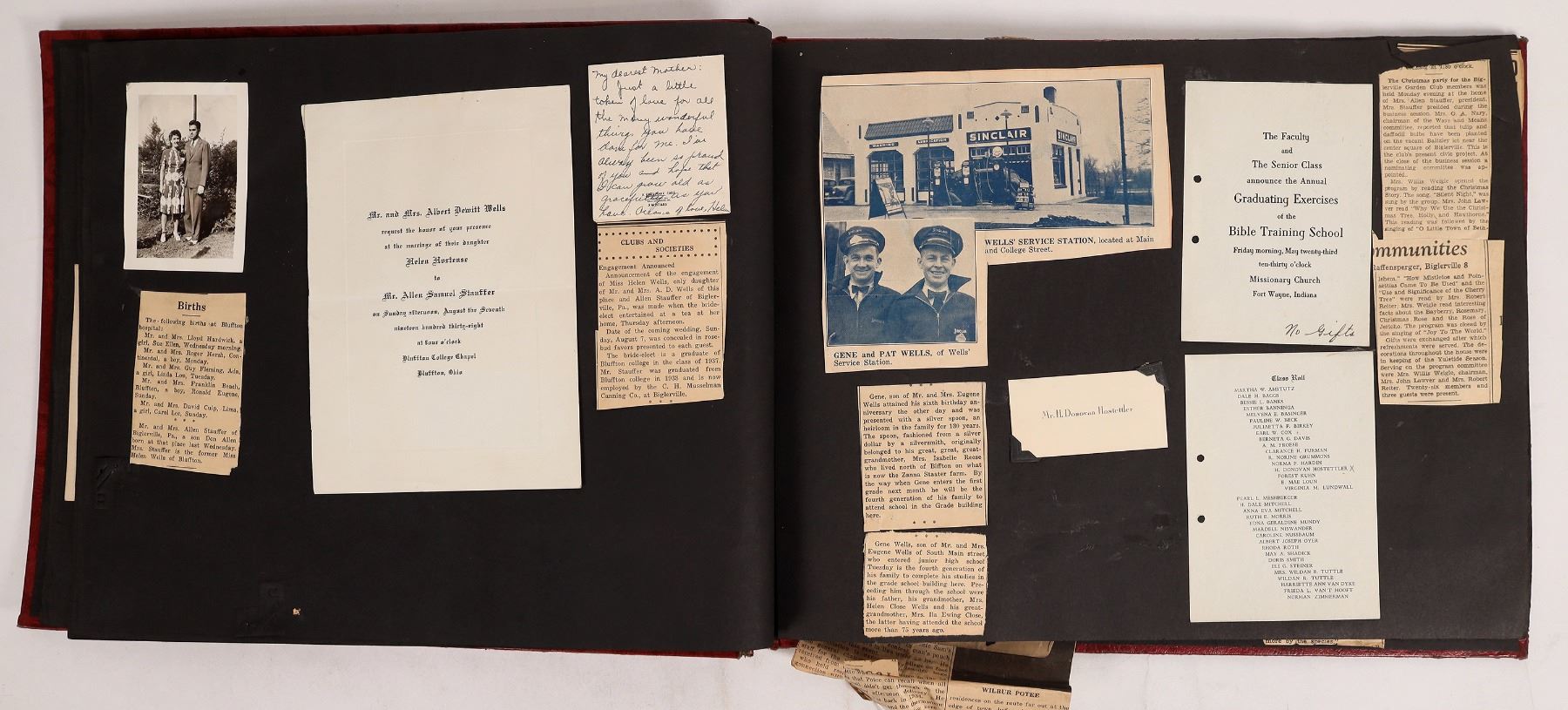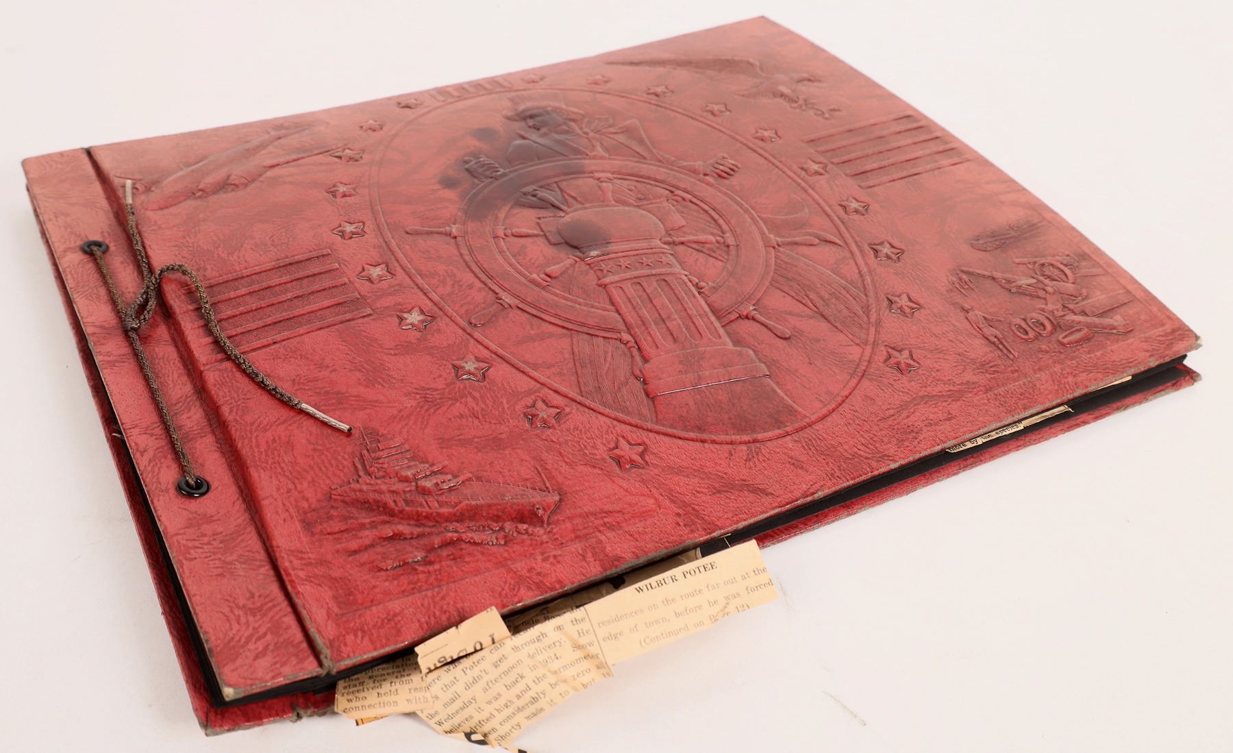 Nice embossed red leather scrap book cover featuring a battleship, bomber, artillery and a US political theme. Scrap book has family photos, newspaper clippings etc. from an Ohio family. 11.5x15".