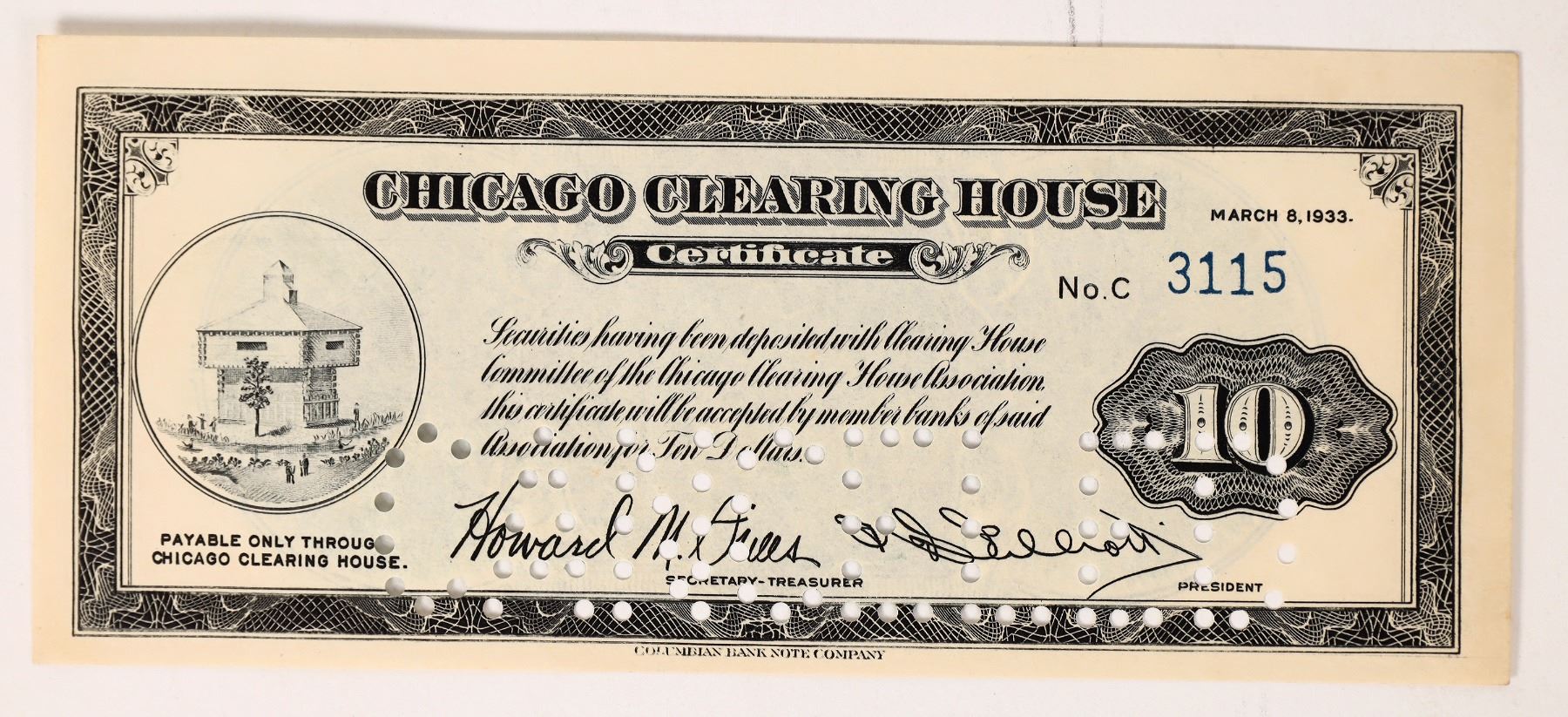 Chicago Clearing House Certificate in the amount of $10 and dated March 8, 1933. Hand canceled. Please see photos for more details. Illinois Chicago 1933