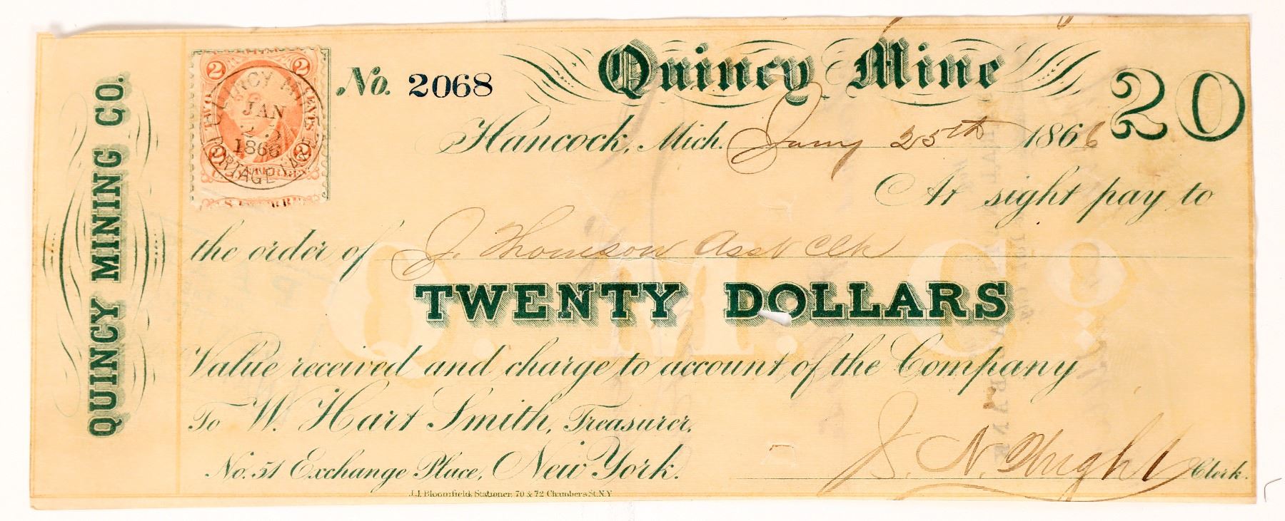 An example of private money, 1866 scrip with 2c orange Washington adhesive revenue.