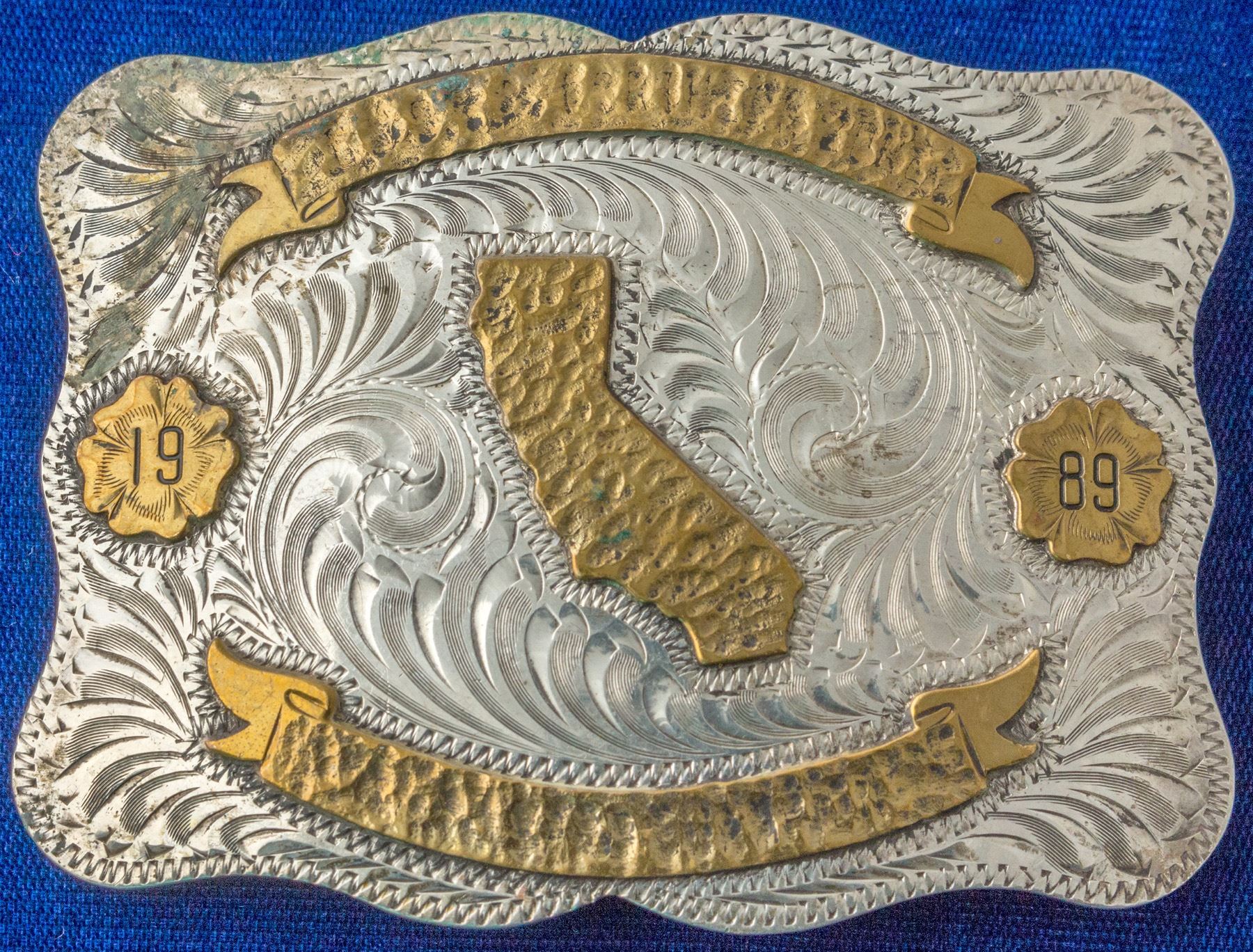 Scrolled edges western belt buckle with gold scrolling - top and bottom (used to say something?), and gold state of California centered overlay on silver plated planchet. Two gold flowers (gold plated?) with 19 and 89 inscribed on them is present. Size: 3.5" x 2.75". Very good condition. State: City: HWAC#: 47957 Date: