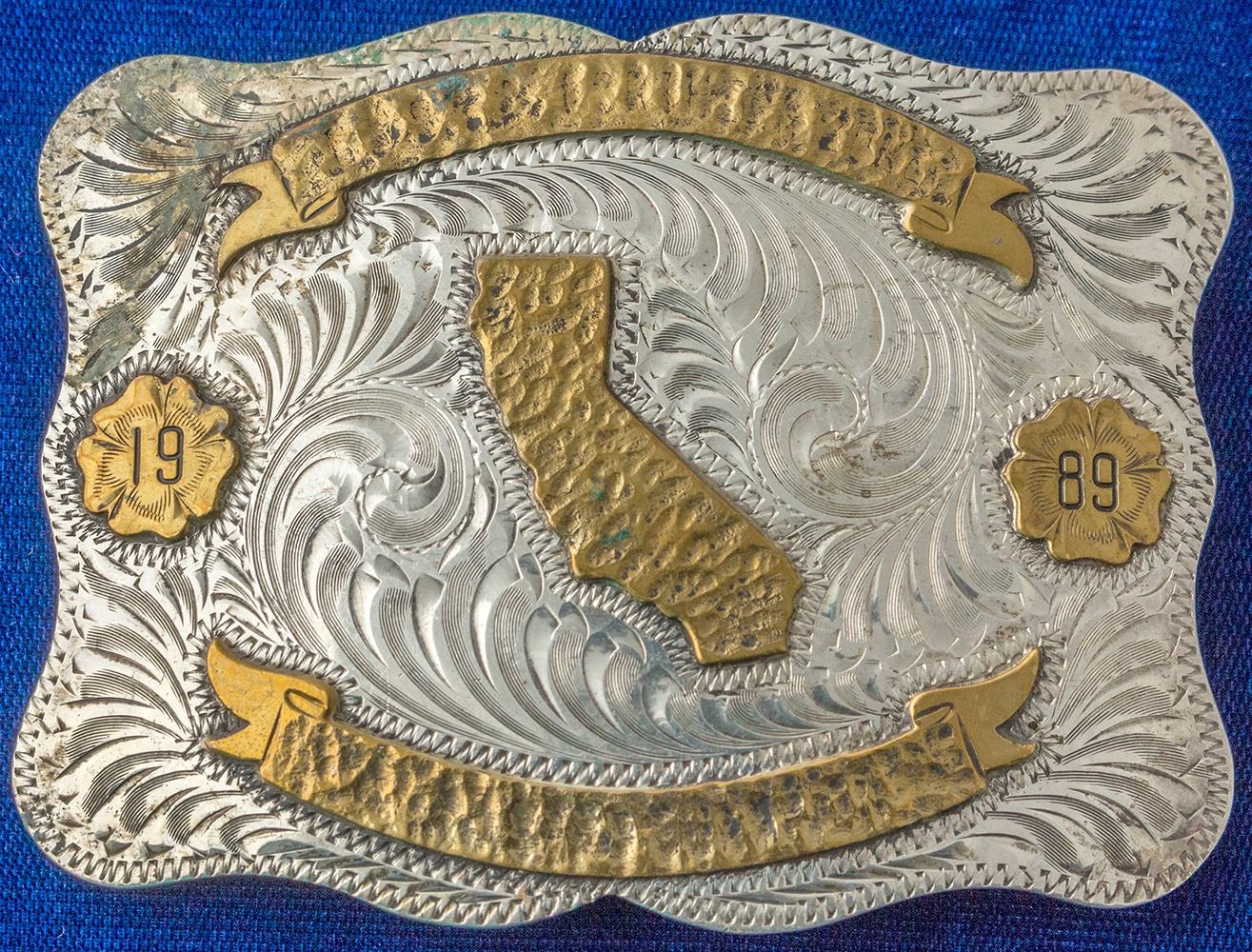 Scrolled edges western belt buckle with gold scrolling - top and bottom (used to say something?), and gold state of California centered overlay on silver plated planchet. Two gold flowers (gold plated?) with 19 and 89 inscribed on them is present. Size: 3.5" x 2.75". Very good condition. Date: Location: HWAC# 47957