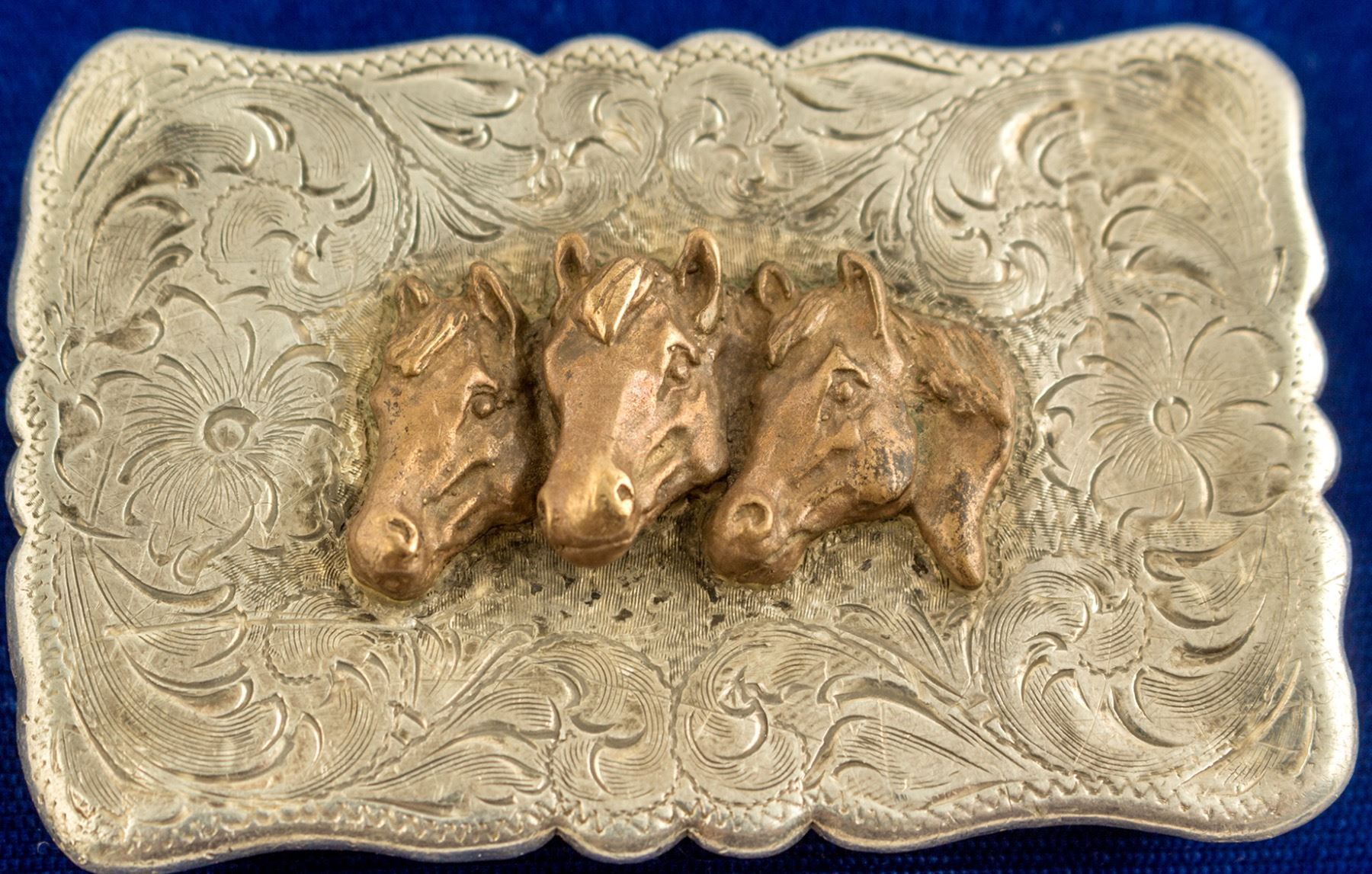 Rectangular shaped scrolled edges sterling silver belt buckle. Detailed intricately etched planchette depicting western motif (plants, vines, flowers). In the center are three bronzed colored horse heads. Detailed and some of the horses look like they have their necks turned and are looking at you. Weight: 61.4 grams. SIZE: 3" x 2". In good condition, does exhibit some light scratches. Stamped on back "Diablo." State: City: HWAC#: 48225 Date: