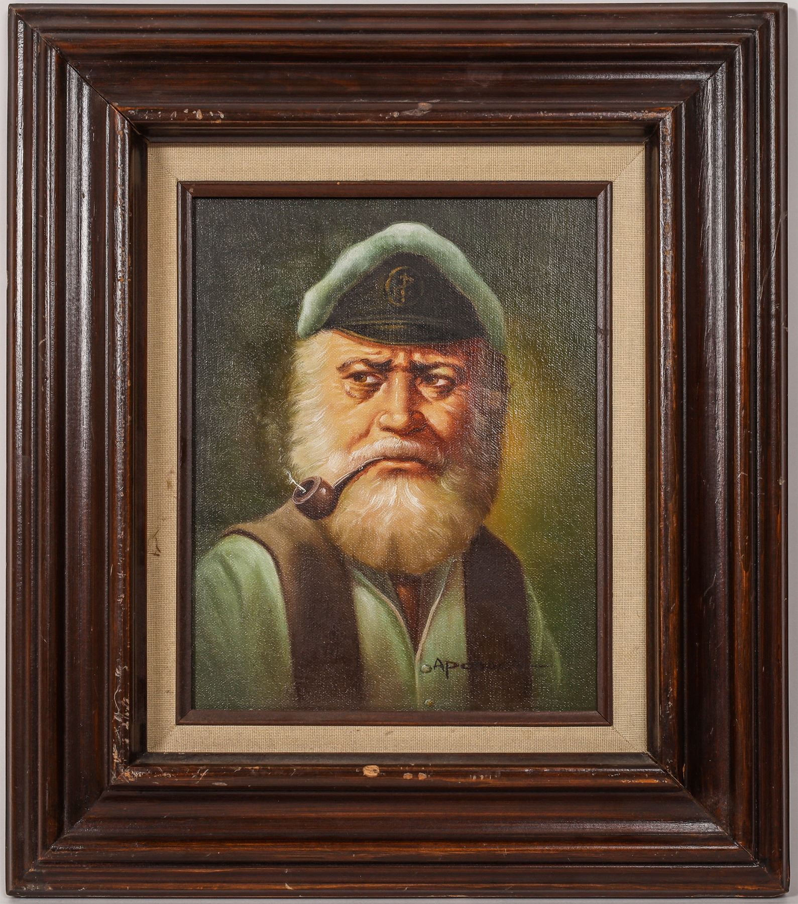 This painting is of a "Sea Captain" by artist Apodaca. Canvas at 7.5 in. X 9.5 in. and framed at 14.5 in. X 17 in. Signed APODACA lower right corner of a sea captain with the fouled anchor on his cap. C. 1970's, the frame shows wear. Please see photos for details.