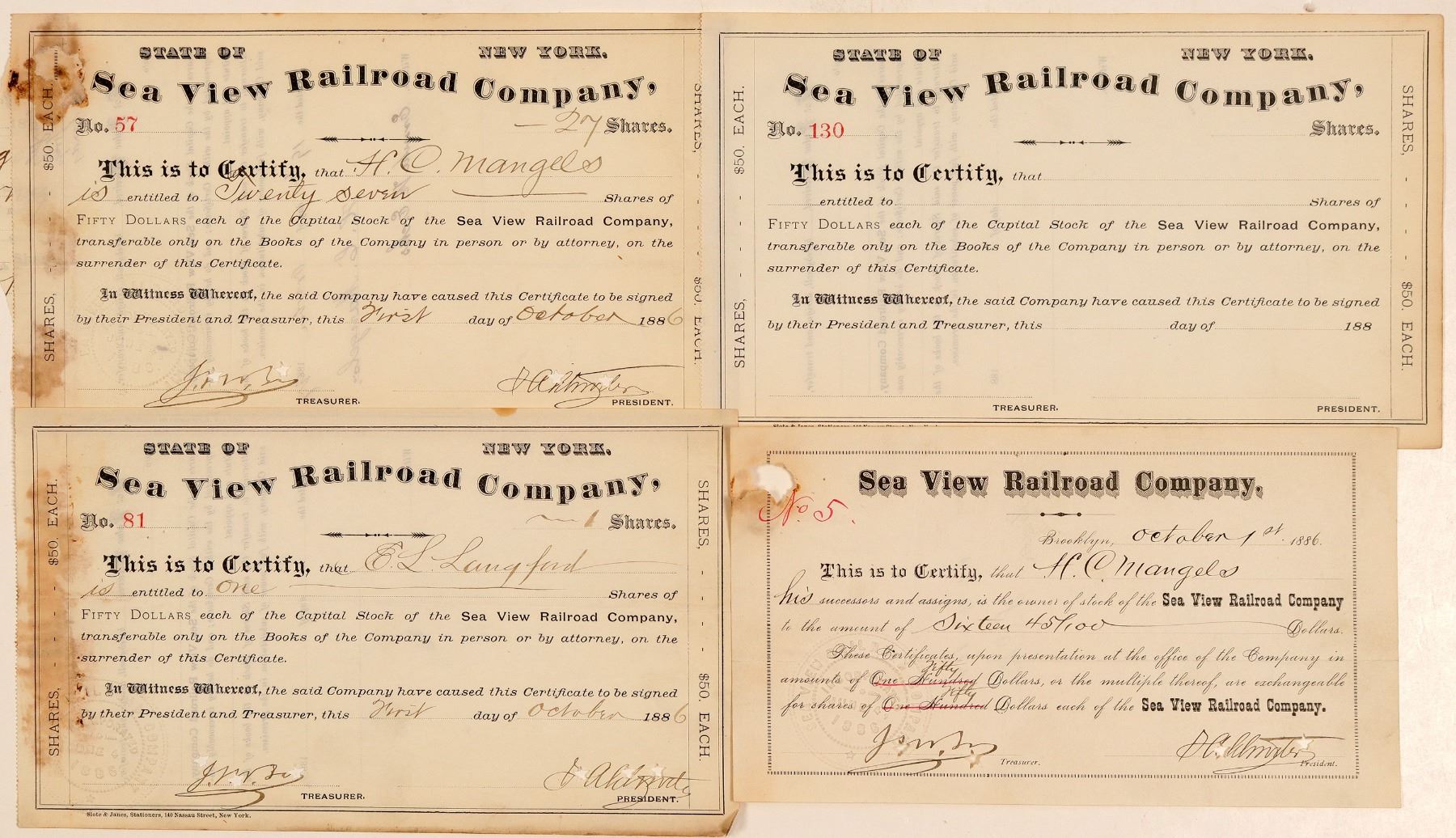 Four Certificates. All: $50 par shares, BLACK on white paper, embossed seal, no vignette, Slote & Janes Stationers printer. #5, I/C, issued Oct 1, 1886, small tear top left. #57, I/C, issued Oct. 1, 1886. # 81, I/C, issued Oct 1, 1886. # 130, U/U. Ken Prag Collection