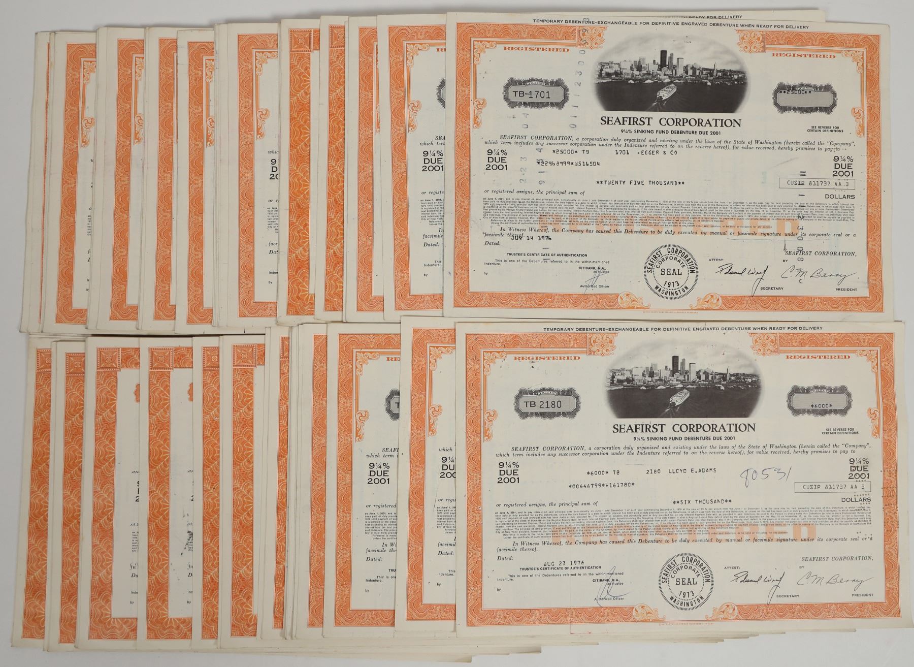 About 160 SeaFirst Corporation Sinking Fund Debentures Issued in 1976-77 and due in 2001, this company's story is rooted in stock market crashes, scandals and banking disasters. Seafirst was an American bank holding company in Seattle, Washington formed in 1929 following the Great Depression, that issued many bonds underwritten by Solomon Brothers (of the 1990s banking scandal) and, after posting huge losses from loans it purchased from the failed Penn Square Bank, was acquired by Bank of America in 1983, a victim of the "the worst recession since the Great Depression" and later party to major Federal lawsuits. This lot might be a banking disaster and securities scandal researcher's goldmine.