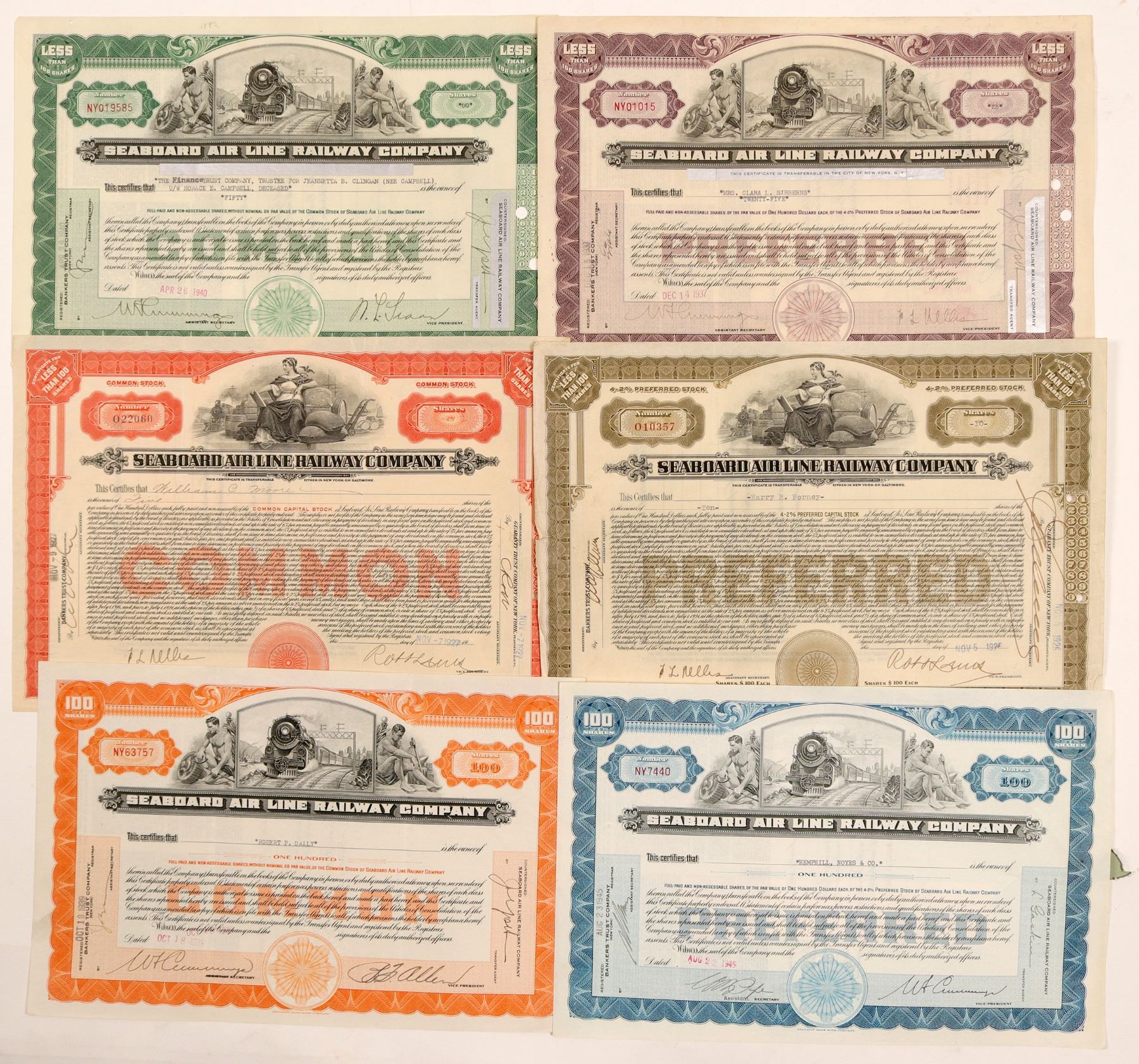 6 stock certificates. 1. Two "less than 100 shares", I/U, vignettes allegorical female seated on agriculture products, American Bank Note Co printer. #010357, 10 shares, issued Nov 5, 1925. GREEN, PREFERRED green underprint. #022060, issued Nov. 7, 1927. ORANGE, COMMON in orange underprint. 2. Two "100 shares", I.U, vignette loco and care semi frontal r-l, Security Bank Note Co printer. #NY7440, BLUE, PREFERRED blue underprint. #NY63757, ORANGE, COMMON in orange underprint. Two "less than 100 shares", #NY01015, PURPLE, PREFERRED purple underprint and #NY019585, GREEN, COMMON green underprint. Ken Prag Collection