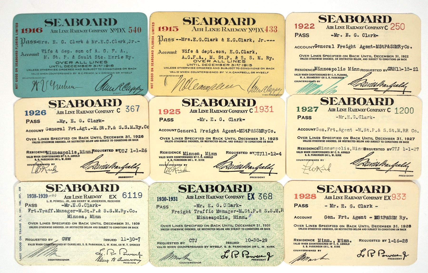 Group of 9 railroad passes from the Seaboard Air Line Railway Company. Passes date from the early 1900s; see photos for specific years and additional detail.
