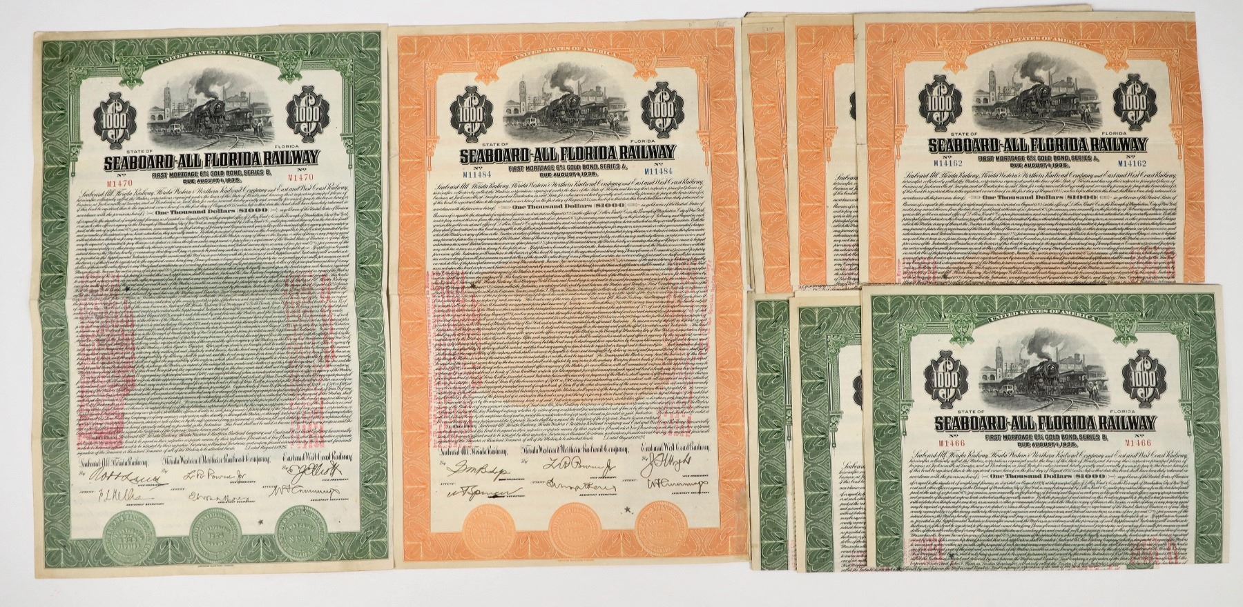 Lot of 10. I/U. Issued 1925. EF cond. Seaboard-All Florida Railway, $1000, 6% gold bearer bonds with coupons. Two varieties. American BNC printer.
