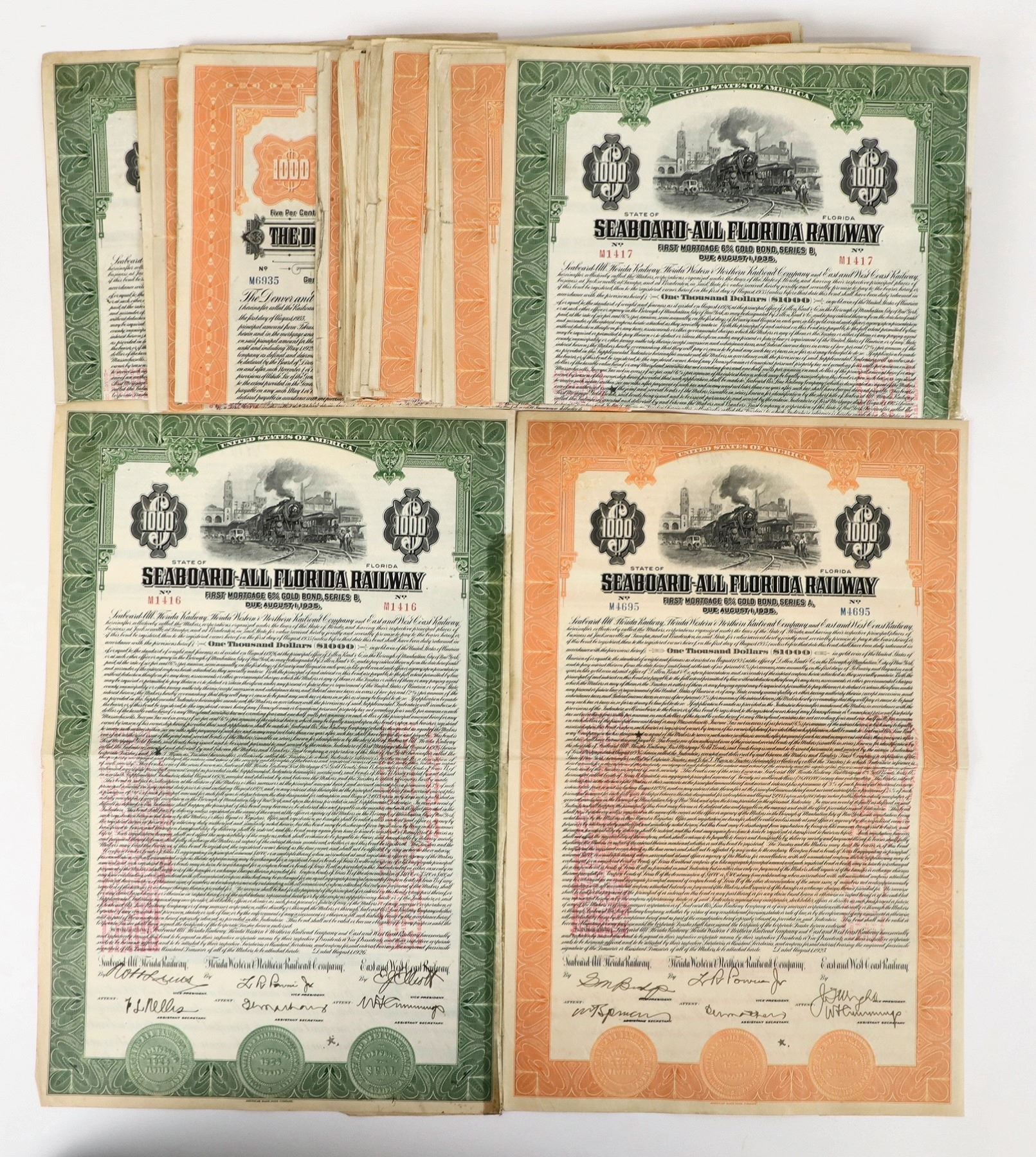 Lot of 10. I/U. Issued 1925. EF cond. Seaboard-All Florida Railway, $1000, 6% gold bearer bonds with coupons. Two varieties. American BNC printer.