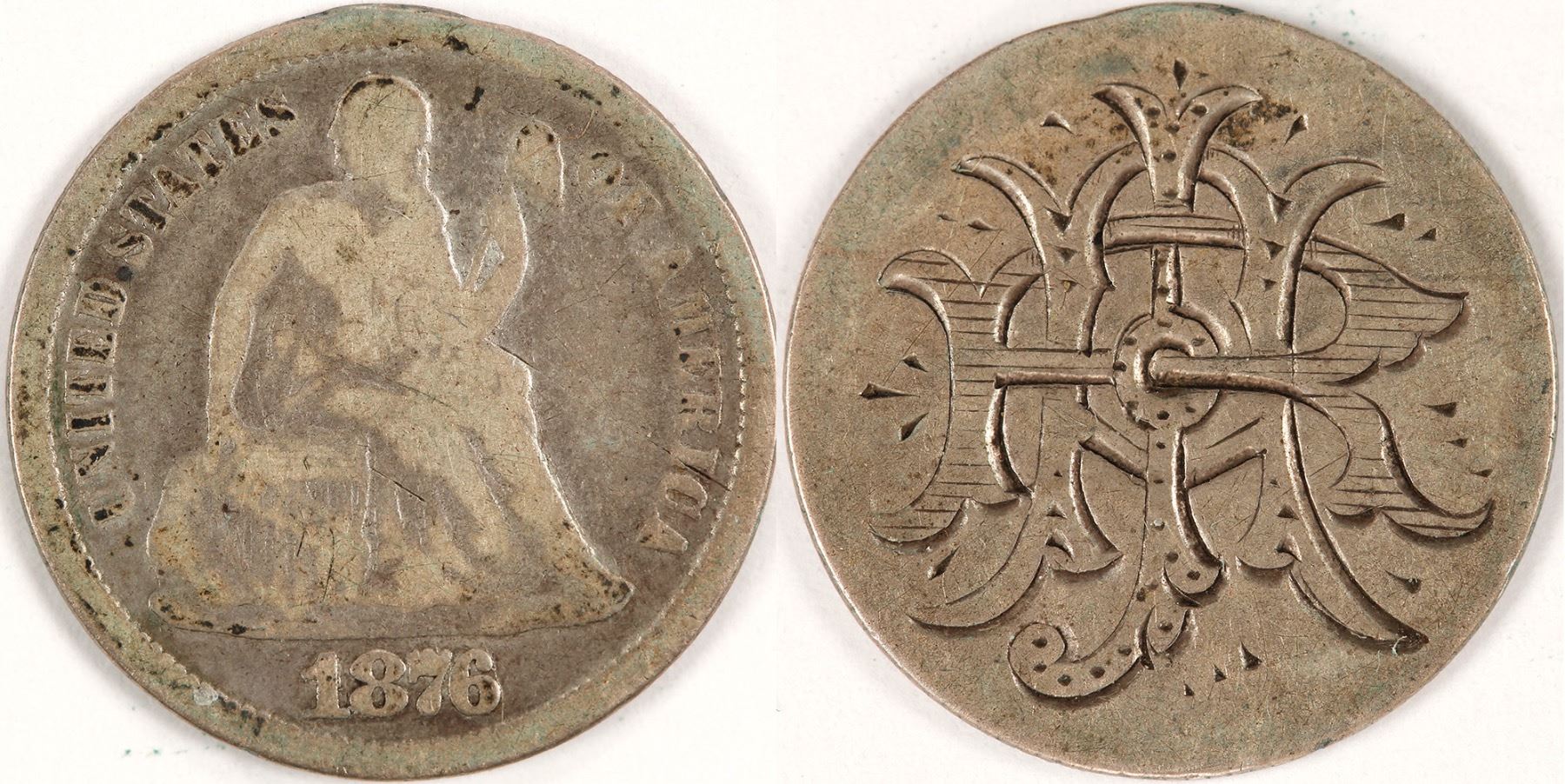 Obverse is an 1876 Liberty Seated dime, reverse is engraved, possibly "H / I / R." HWAC# 61909 Date: 1876 Location: