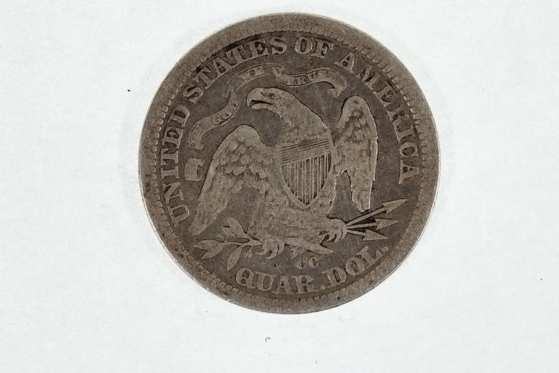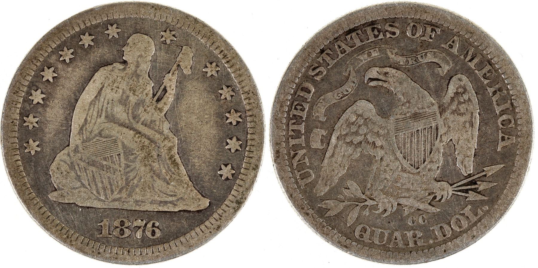 1876 Carson City Seated Liberty quarter found while metal detecting near Old Spanish Mine in Pine Nut Range, NV. Fine condition. This site is the mining camp that provided gold for the first Carson City gold coins ever minted in 1870. Production of 4,944,000, a huge number as they were possibly distributed at Centennial exhibitions etc.