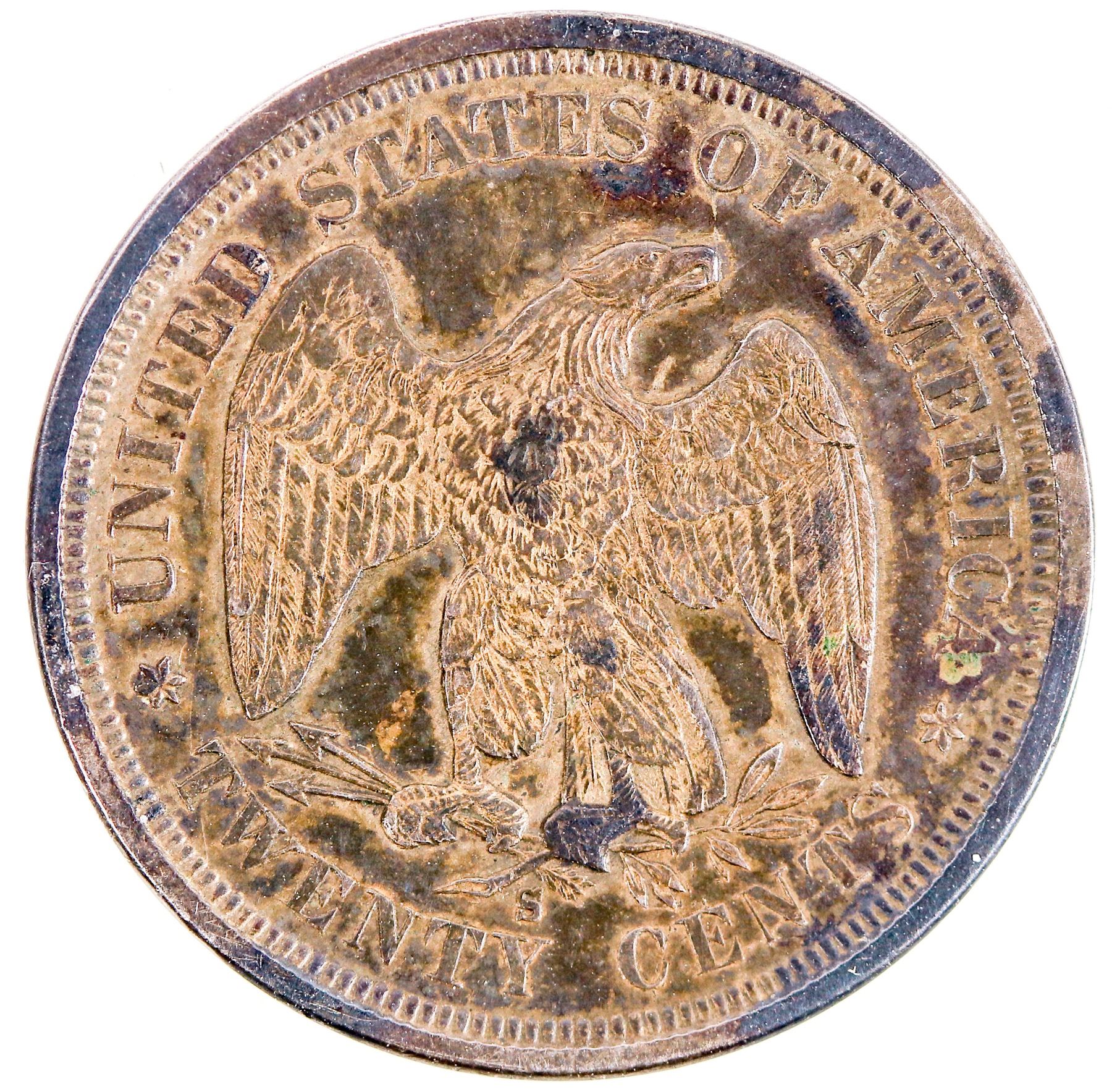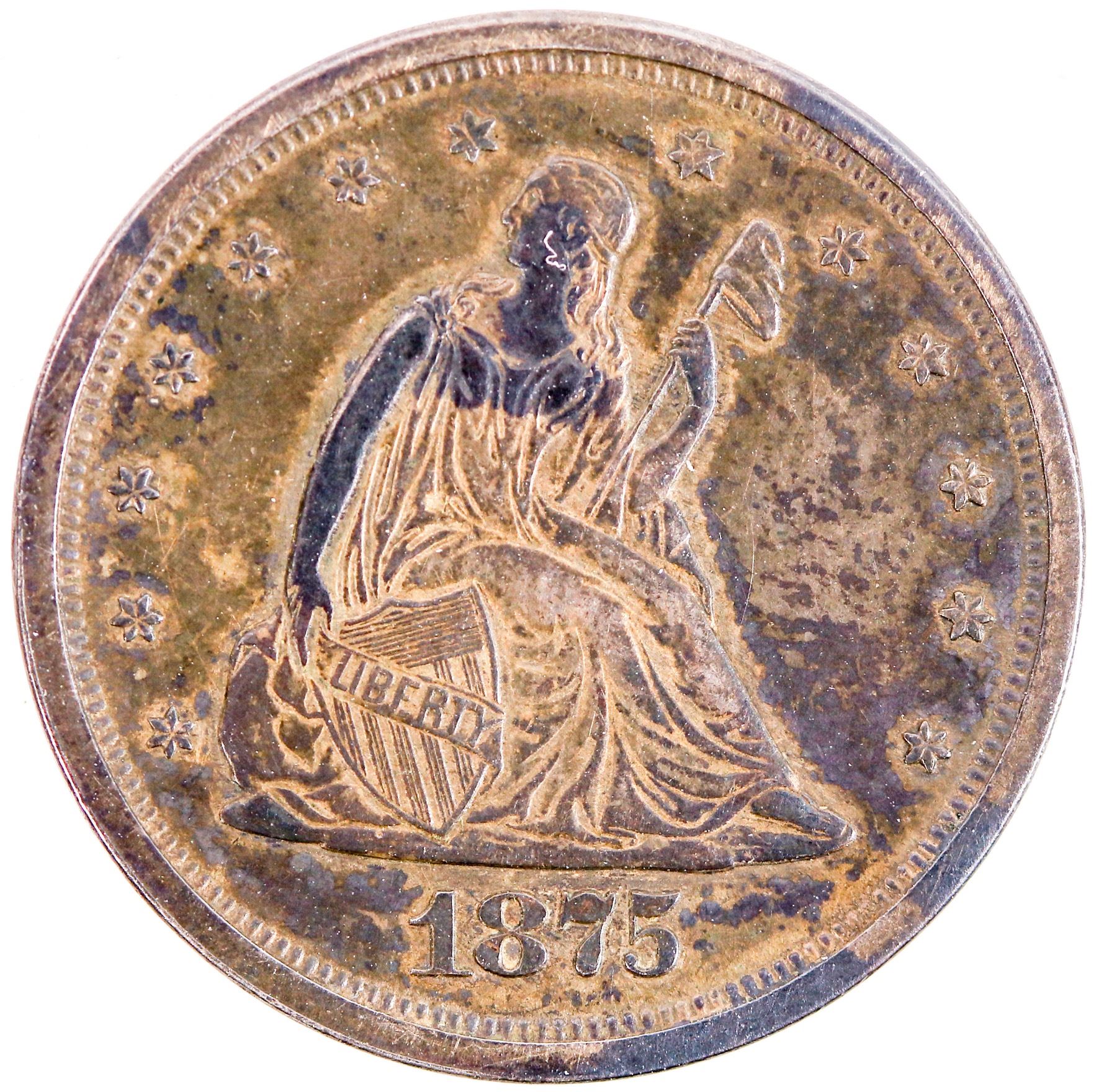 Fabulously toned 1875-S Seated Liberty twenty cent piece. EF-AU condition.