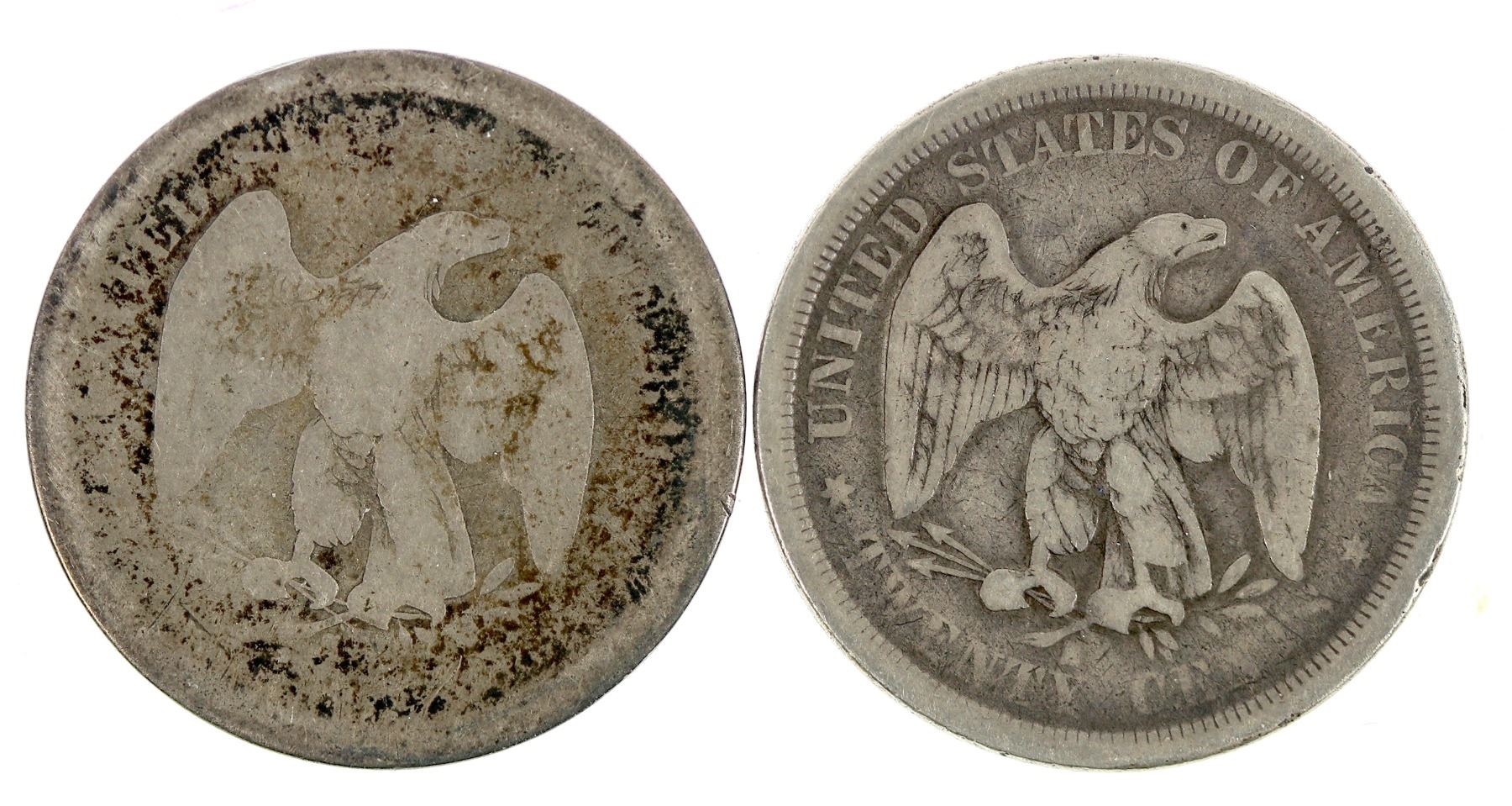 Two 1875-S Seated liberty twenty cent pieces, one AG/G, the other G-VG condition. A short lived coin series, often confused with quarter dollars.