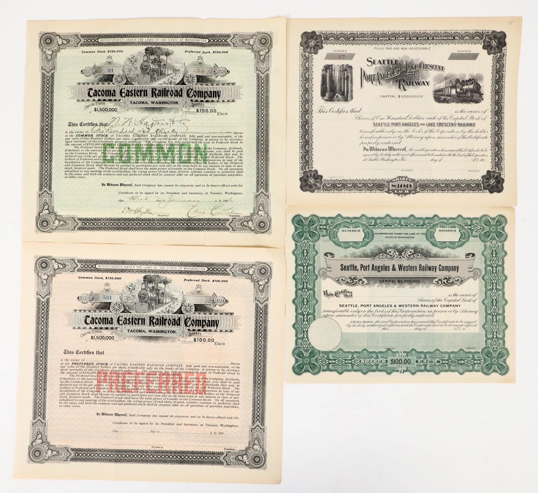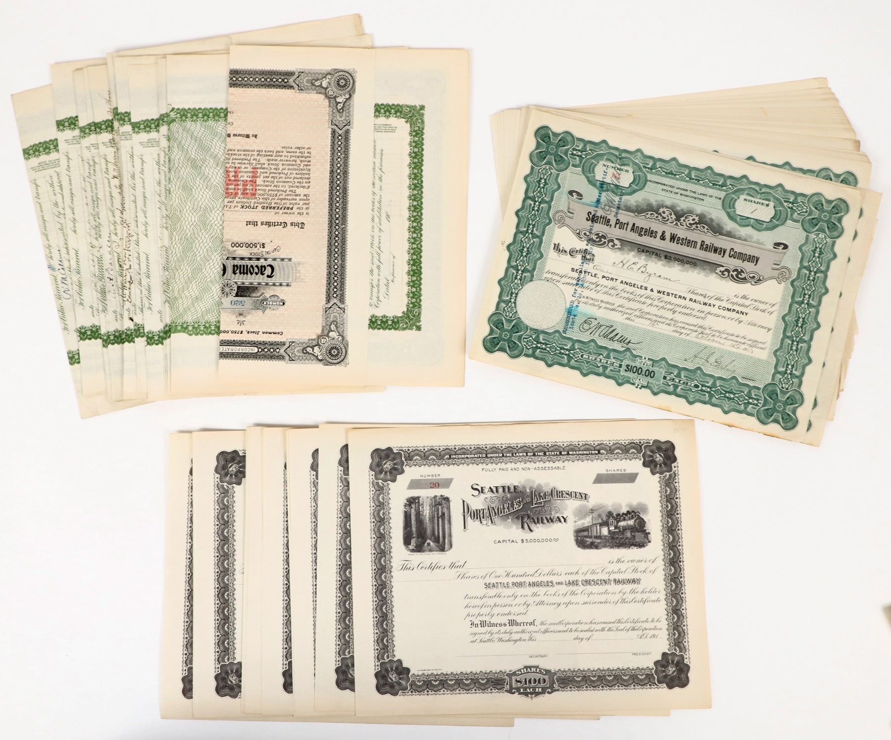 Over 50. I/U, I/C/U/U. Issued 1906-10. Fine or better. Seattle, Port Angeles & Western Railway Co. Stock. Three varieties.