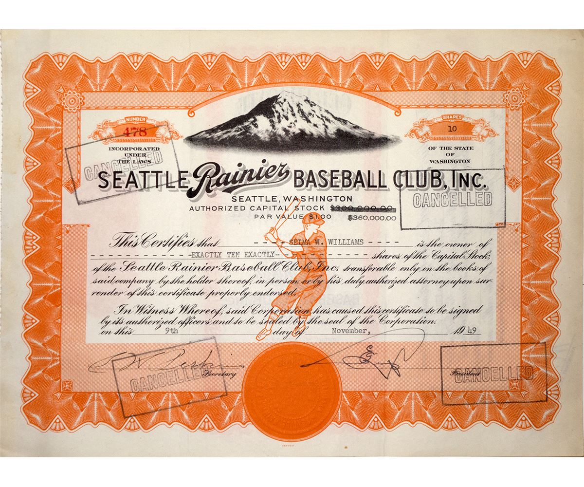 Cert. #178, issued in 1949 to Selma W. Williams for 10 shares and signed by Emil Sick as president and S.W. Perkins as secretary. Mount Rainier pictured at the top with a underprint of a baseball player at bat at the center. Emil Sick was the president of the baseball club and also owned the Rainier brewery in Seattle. Rainier is printed with the beer company logo in the masthead. It is unusual to have a brewery tie-in with a baseball club, which makes this certificate unique. Stamp cancels do not effect baseball player underprint. EF.