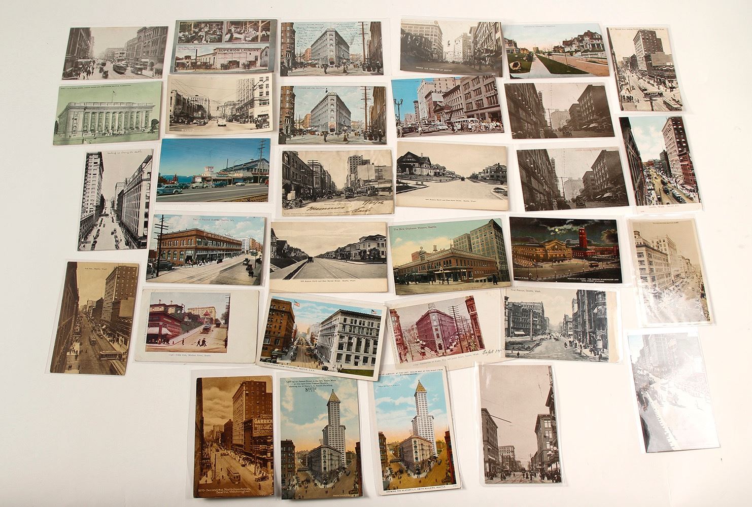 Lot of 32 including 3 real photo. RPCs: birds-eye Second & Pike, c.1930s and street level Second & Pike; and a 1950s street scene. Other cards are a mixture of early cards and more modern including: Superior Laundry; New Orpheum Theatre; Upper Second Ave.; train station at night; cable cars on Madison Street; Pike St.; Frederick & Nelson; Third Ave.; Yesler & James; Cherry St.; Pioneer Square; court house; First Ave.; and residential scenes. Ten mailed cards, 1906-1957. (Prag Collection) Date: Location: Seattle, Washington HWAC# 55469